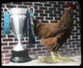 Title: Rooster next to trophy and ribbons, Northwest Fair, Minot (ND), ca. 1934