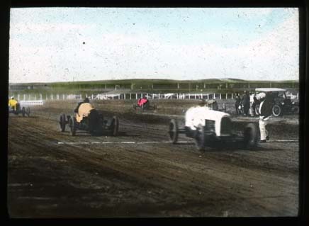 Title: Automobiles racing at Northwest Fair, Minot (ND), ca. 1920s (probably a Landsverk photograph)