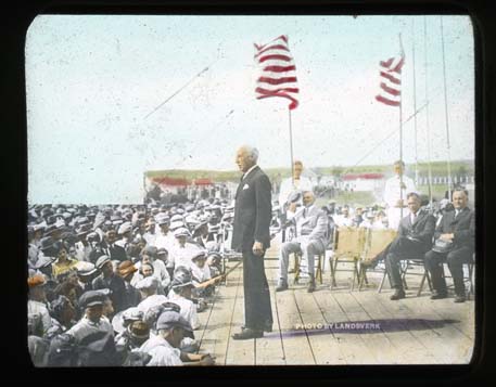 Title: Man speaking to audience at Northwest Fair, Minot (ND), ca. 1920s (Landsverk photograph)