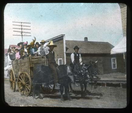 Title: “Cheer! Cheer! The Gang’s here” group in cart pulled by an ox team, ca. 1934