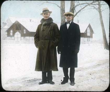 Title: Two unidentified men, church or fair building in the background, ca. 1934 (one may be “Danielson” featured in earlier slides)