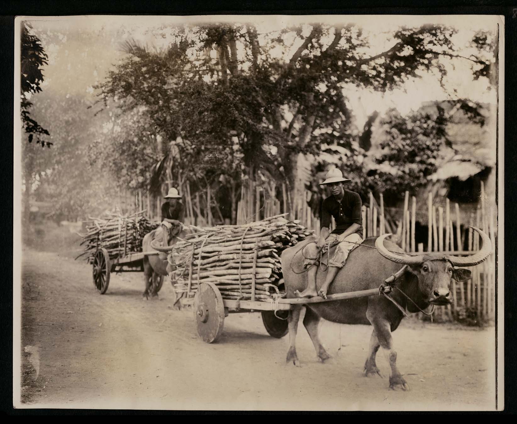 2008-P-012-p08-00001 Natives using carabao or water buffalo to haul wood to city of Manila Phillipines 1898