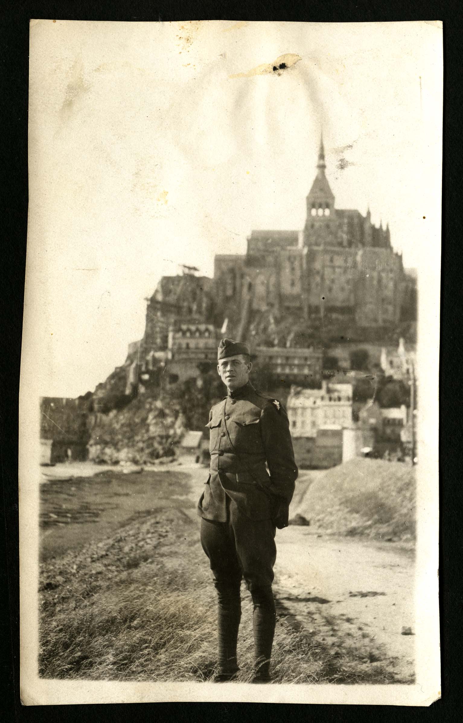 2008-P-012-p11-00001 Man standing on beach in front of Mont Saint-Michel Normandy France