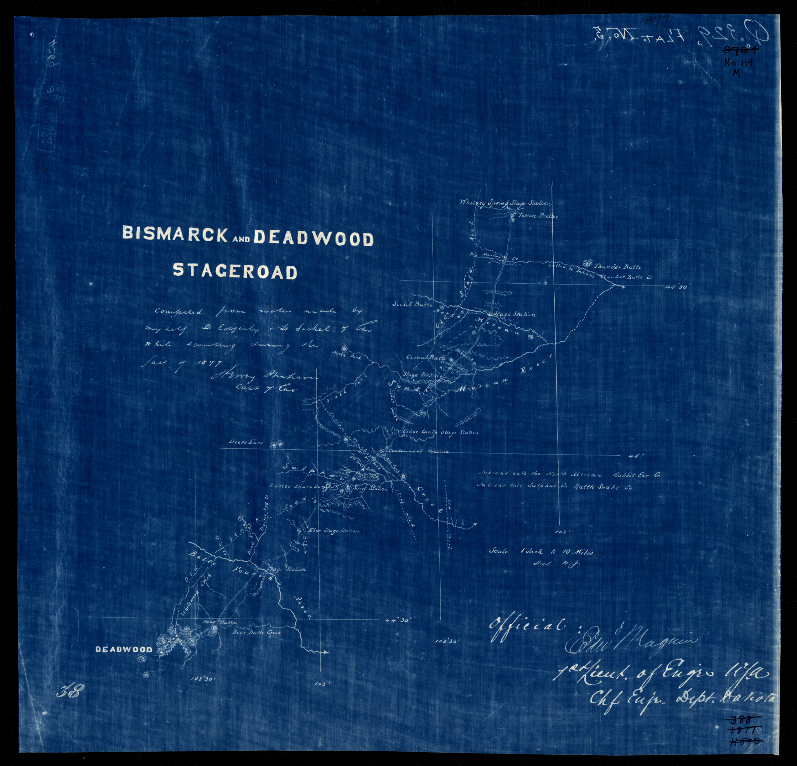 Collection: 978.402 H6636b 1877 - Bismarck and Deadwood stageroad compiled from notes made by myself, Lt. Edgerly & Lt. Sickel, 7 Cav. while scouting during the fall of 1877 / __ __Henry Hinkson
