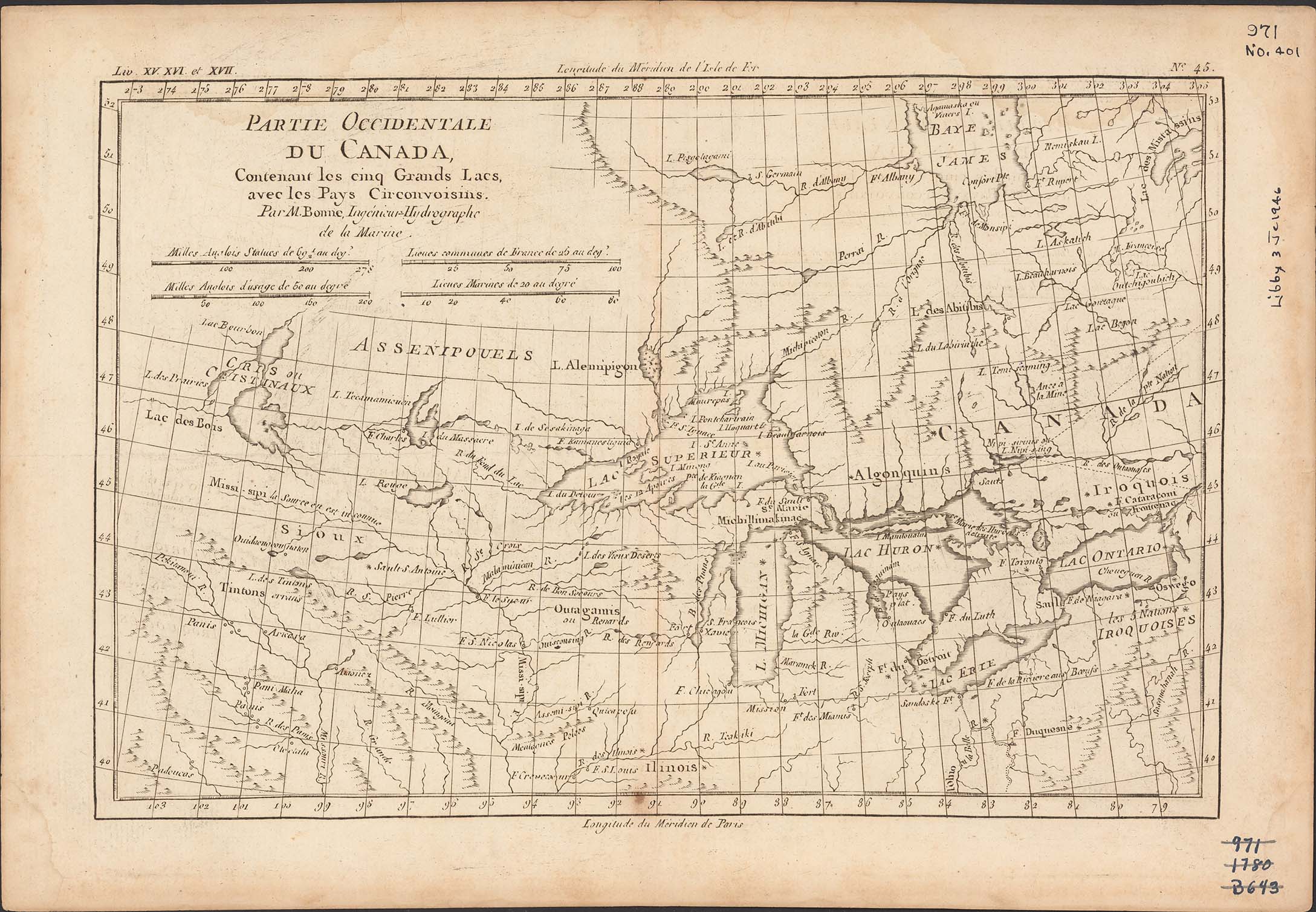 Collection: 977.01 B7163p 1780 - Partie occidentale du Canada, contenant les cinq Grands Lacs, avec les pays circonvoisins / __ __par M. Bonne