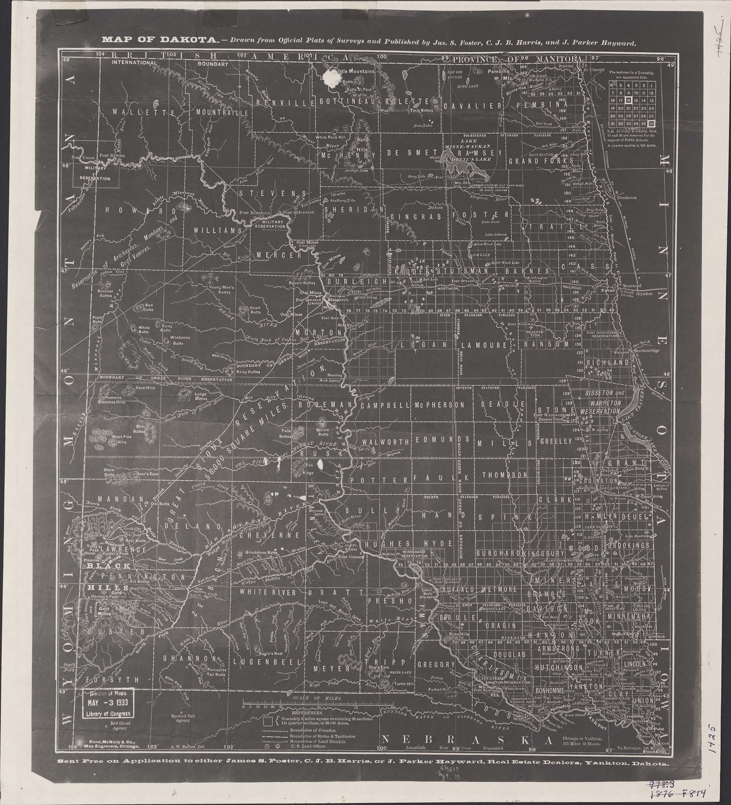 Collection: 978.402 F814m 1876 - Map of Dakota / __ __drawn from official plats of surveys and published by Jas. S. Foster, C.J.B. Harris, and J. Parker Hayward
