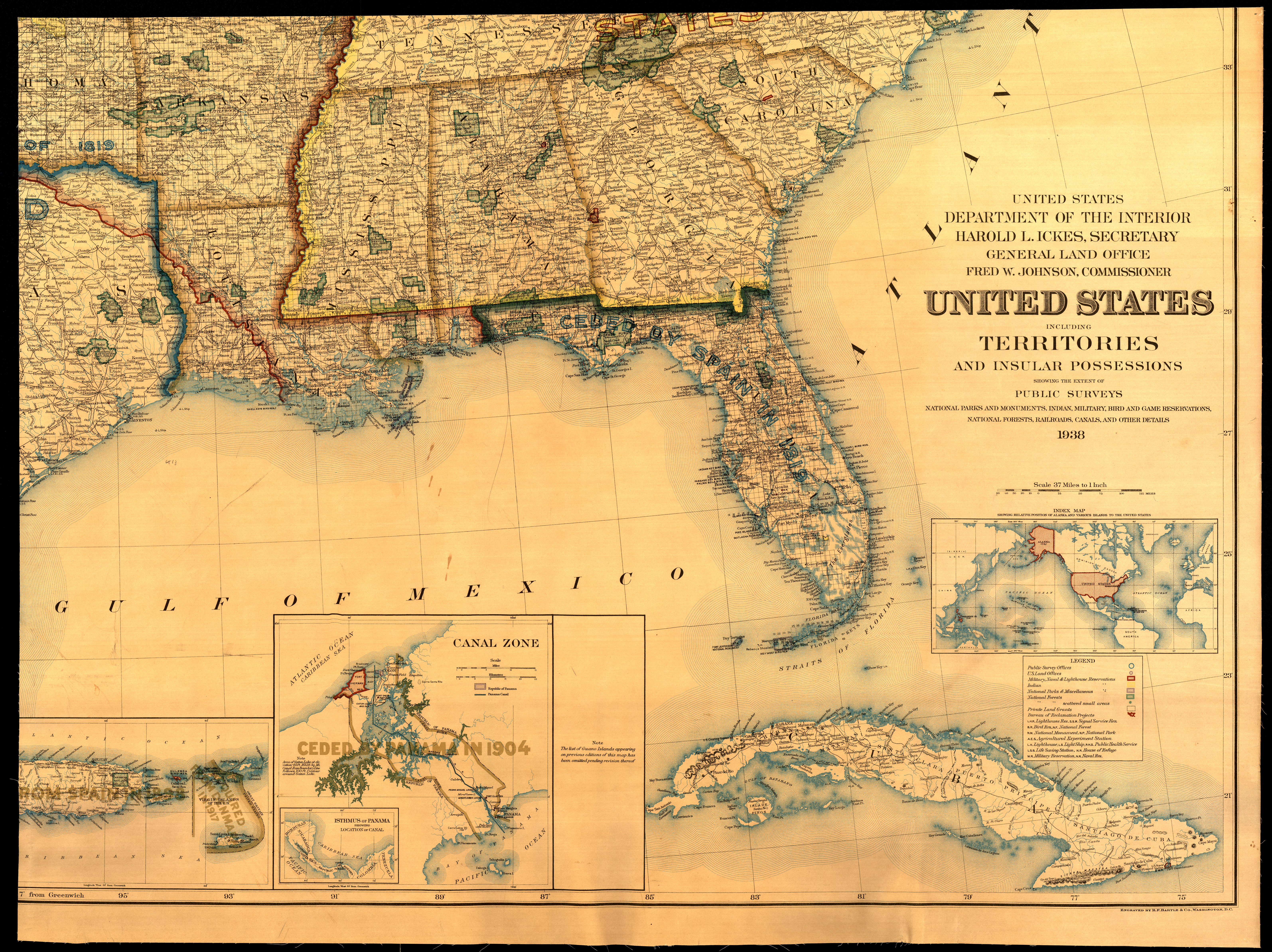 Title: United States, including territories and insular possessions showing the extent of public surveys : __national parks and monuments, Indian, military, bird and game reservations, national forests, railroads, canals and other details, 1938 / __engraved by R.F. Bartle & Co., Washington, D.C. ; United States Department of the Interior, General Land Office