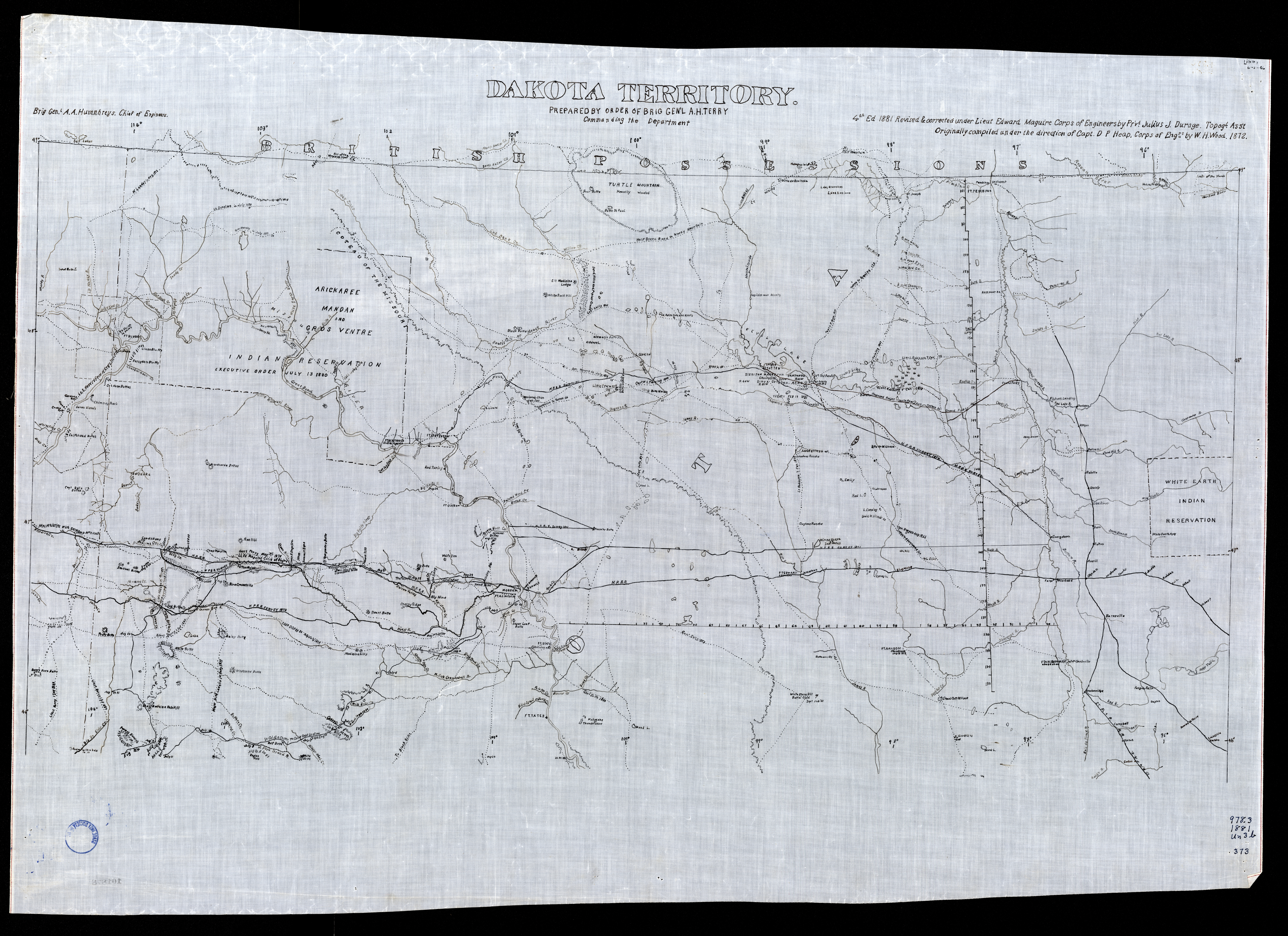 Title: Dakota Territory / __ __prepared by order of Brig. Gen'l A.H. Terry, commanding the department ; Brig. Genl. A.A. Humphreys, Chief of Engineers ; revised & corrected under Lieut. Edward Maguire, Corps of Engineers, by Pr'vt. Julius J. Durage, topogl. ass't. ; originally compiled under the direction of Capt. D.P. Heap, Corps of Engrs. by W.H. Wood, 1872