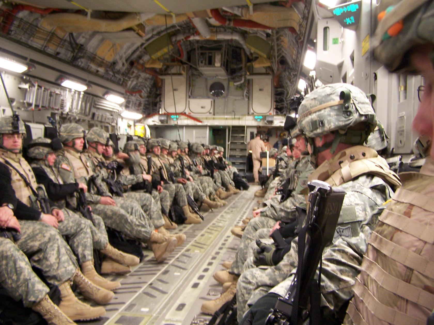 Title: Soldiers in combat gear aboard a transport plane