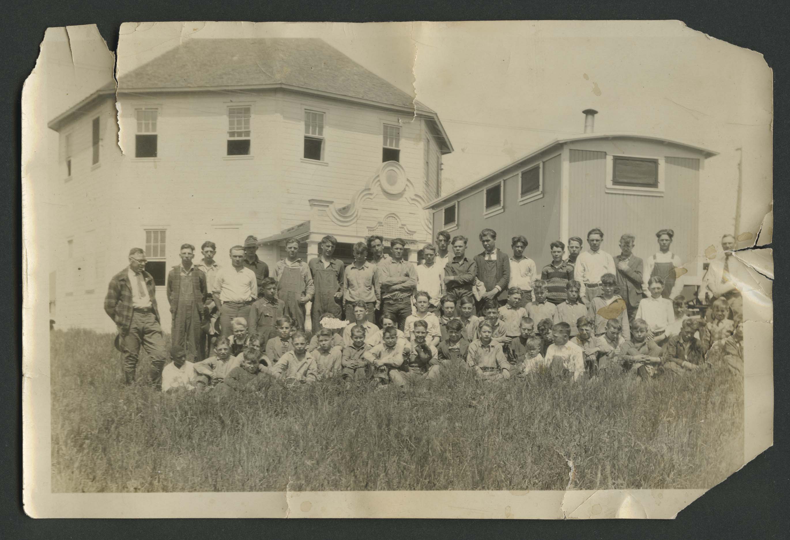 Title: Group of boys and men in front of buildings