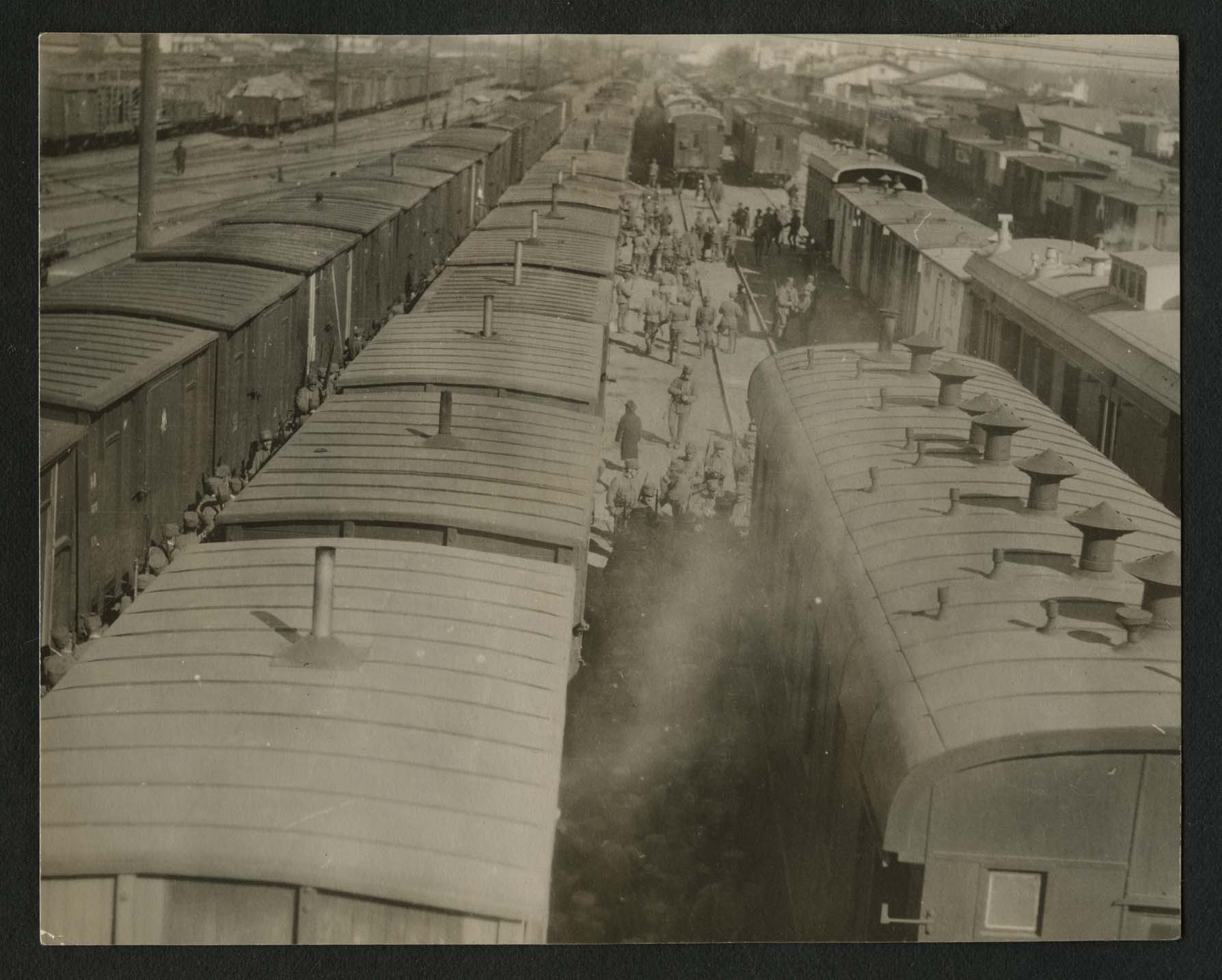 Title: 2008-P-012-p12-05 Red Cross staff with 700 Siberian Refugee children in railroad yards at Irkutsk Russia 1919