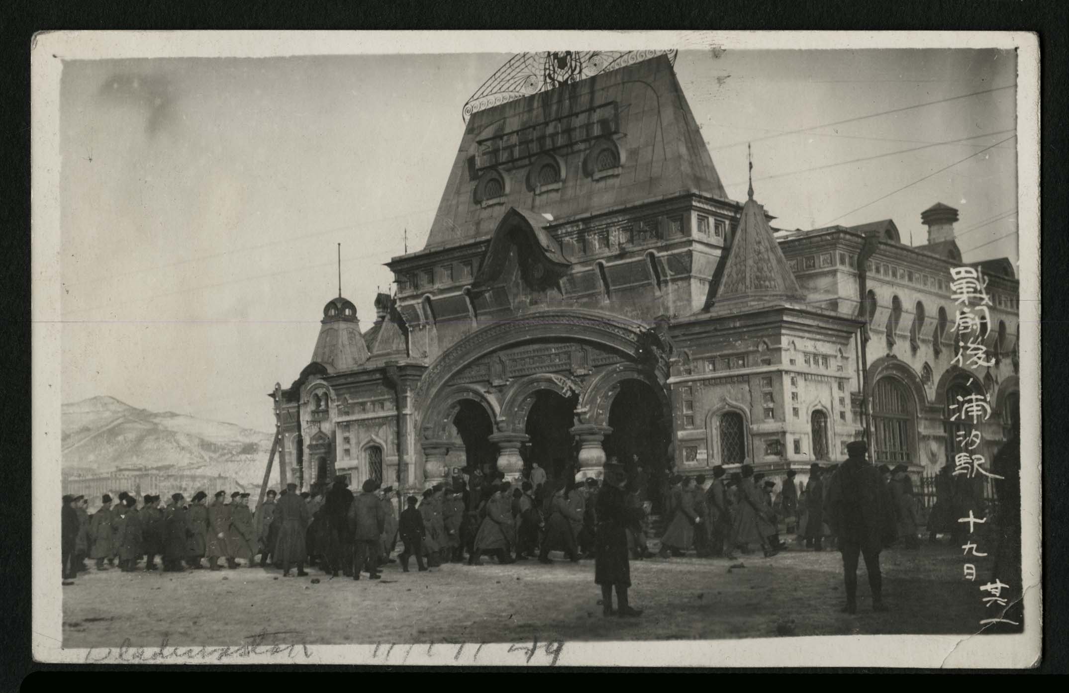 Title: 2008-P-012-p33-04 Admiral Kolchak troops marching in Trans-Siberian Railroad Station after revolution Vladivostok 11-17-1919