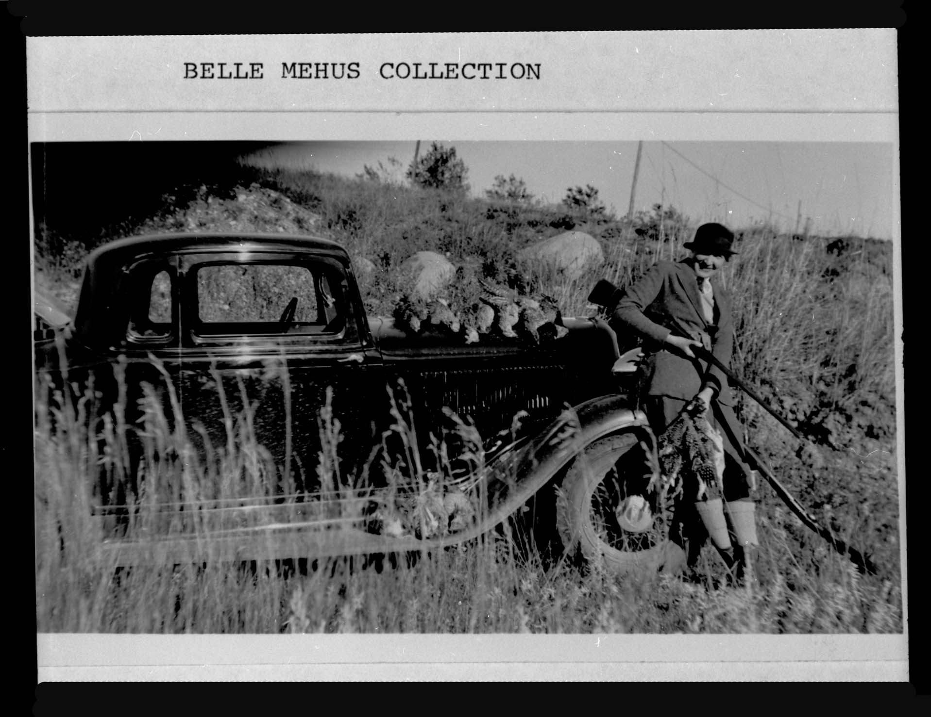Title: 00745-00001-negative Woman hunter with birds on hood of automobile