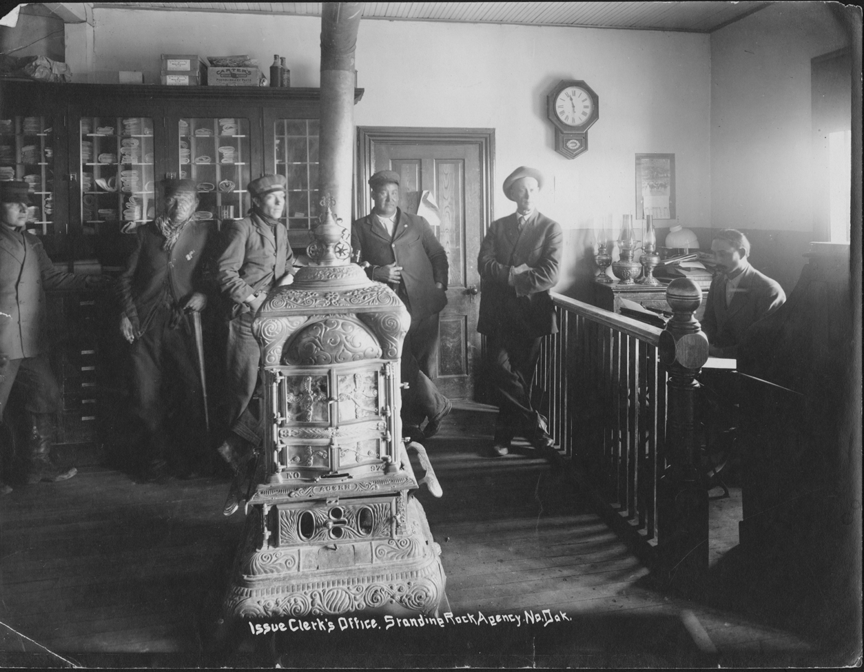 Summary: Men standing around wood stove: Joe Menz, unidentified, unidentified, Gayton, Thomas Reedy, and Ben White.