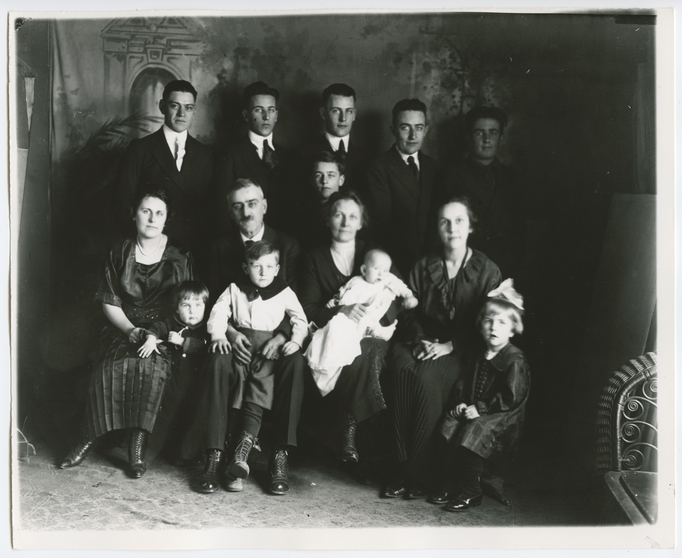 Summary: Full length studio portrait of fourteen members of the Carignan family. They include: Rear left to right: 1. Louis La Fave Primeau (son of Louis and Rose Cournoyer Primeau, nephew of Mrs. Frank Fiske, who married Marguerite Carignan) 2. Theodore Carignan (died in Hettinger (N.D.) 3. Charles Carignan (Lives in Kansas City with Wood Construction Company) 4. Jack Carignan, Jr. 5. Pat Carignan Boy in center in front of line of men Unknown. Front left to right: 1. Marguerite Carignan (Mrs. Louis Primeau) 2. Major Carignan 3. Mrs. Carignan 4. Hermina Witzleben (Mrs. Jack Witzelben) Children in front 1. Johnny Carignan 2. Martin Kenel Carignan 3. Lawrence Carignan 4. Virginia Carignan