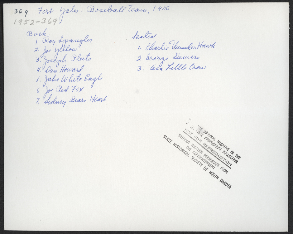 Summary: Studio portrait. Players' uniform shirts and hats say "Standing Rock" and "SR." Players include, in back: Roy Spangler, Joe Yellow, Joseph Pleets, Dan Howard, Jake White Eagle, Joe Red Fox, Sidney Bears Heart; Seated: Charlie Thunder Hawk, George Demers, Asa Little Crow.