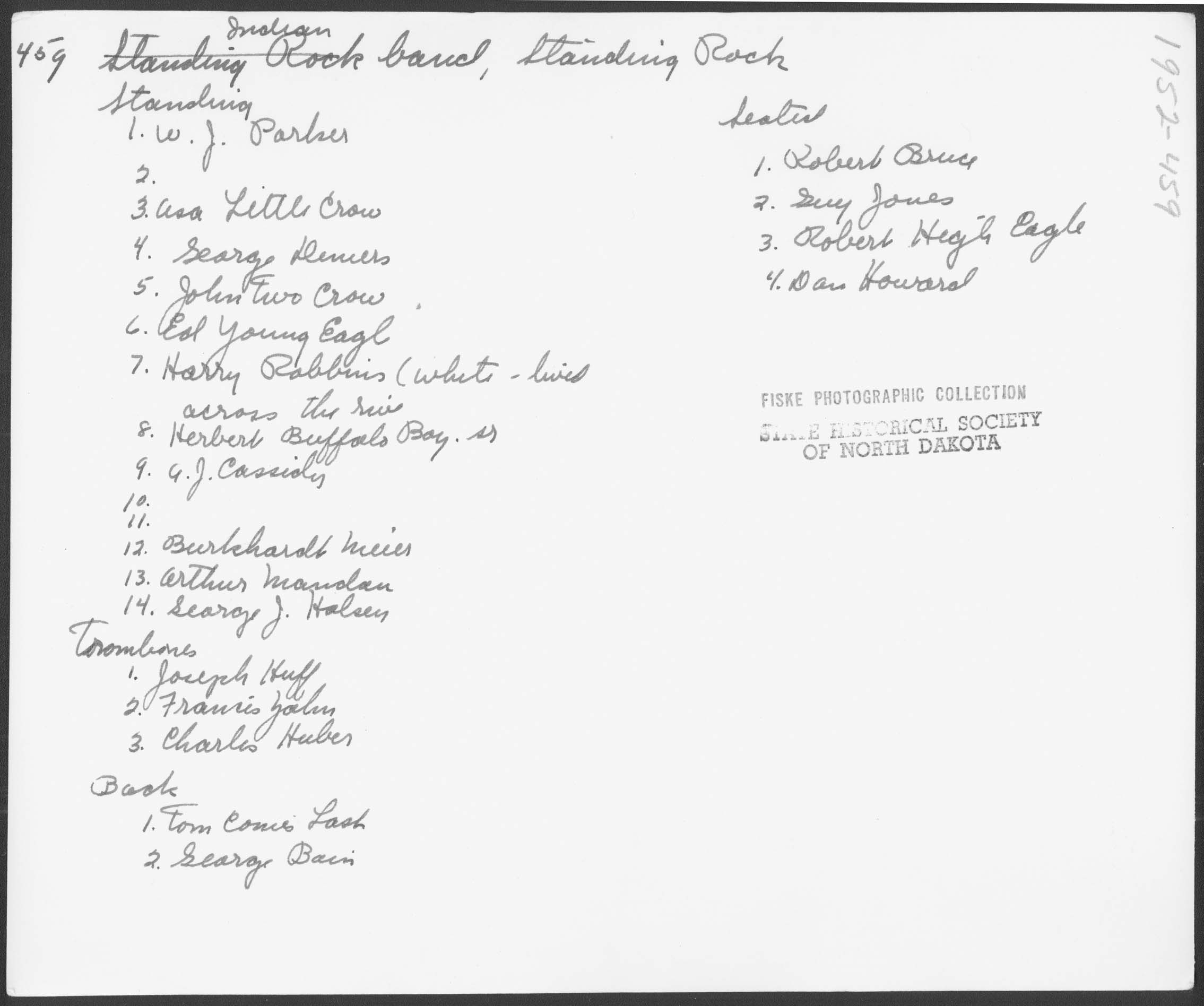 Summary: Standing: W. J. Parker, Asa Little Crow, George Demers, John Two Crow, Ed Young Eagle, Harry Robbins, Herbert Buffalo Boy, Sr., A. J. Cassidy, Burkhardt Meier, Arthur Mandan, George J. Halsen, Joseph Huff, Francis Zahn, Charles Huber, Tom Comes Last, George Bain; Seated: Robert Bruce, Guy Jones, Robert High Eagle, Dan Howard.