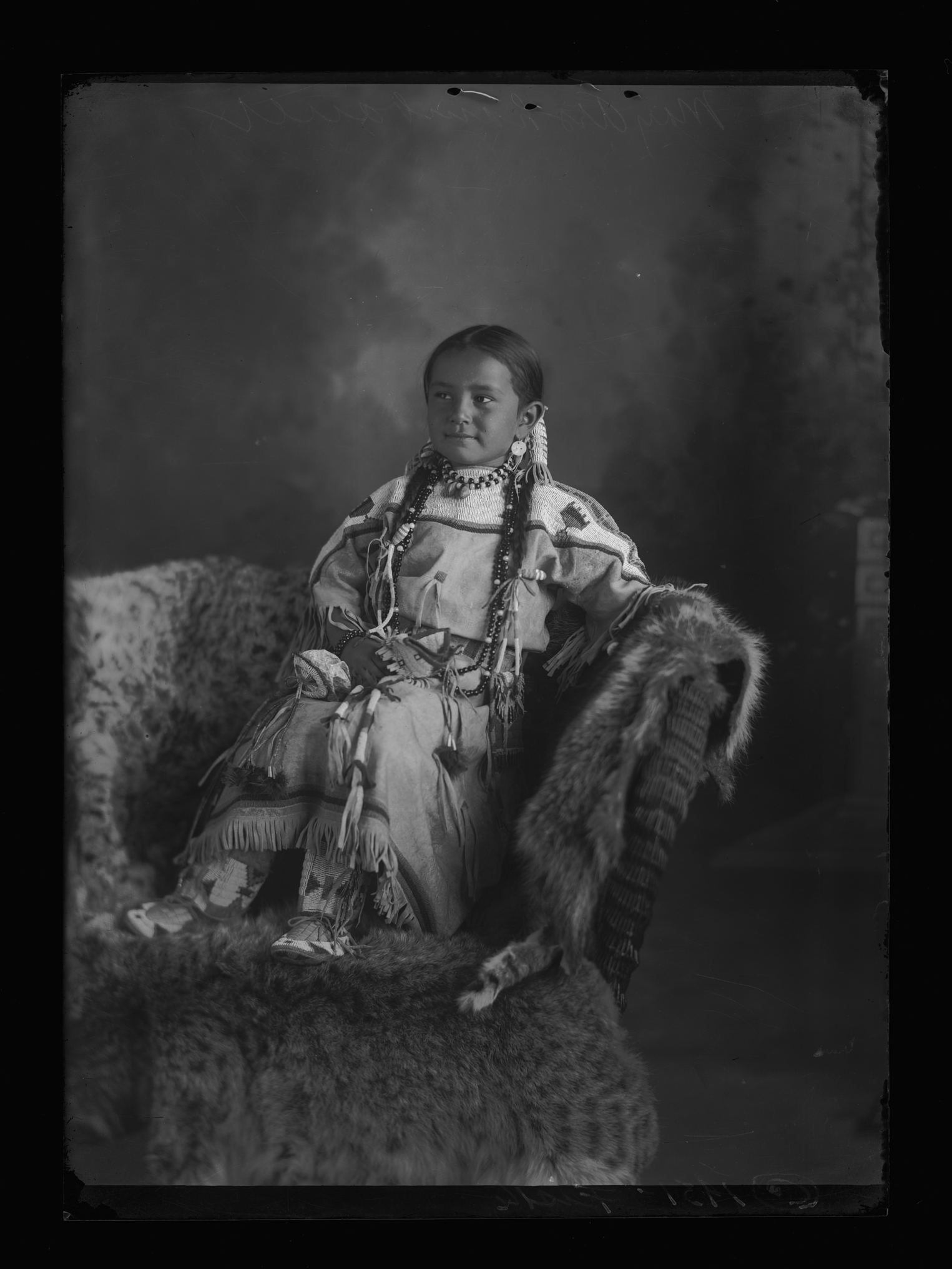 Summary: Mae Archambault sits posed for a portrait in a chair covered with an animal skin. She wears an elaborate beaded and fringed dress and moccasins. She also wears a necklace and ornaments in her braided hair.