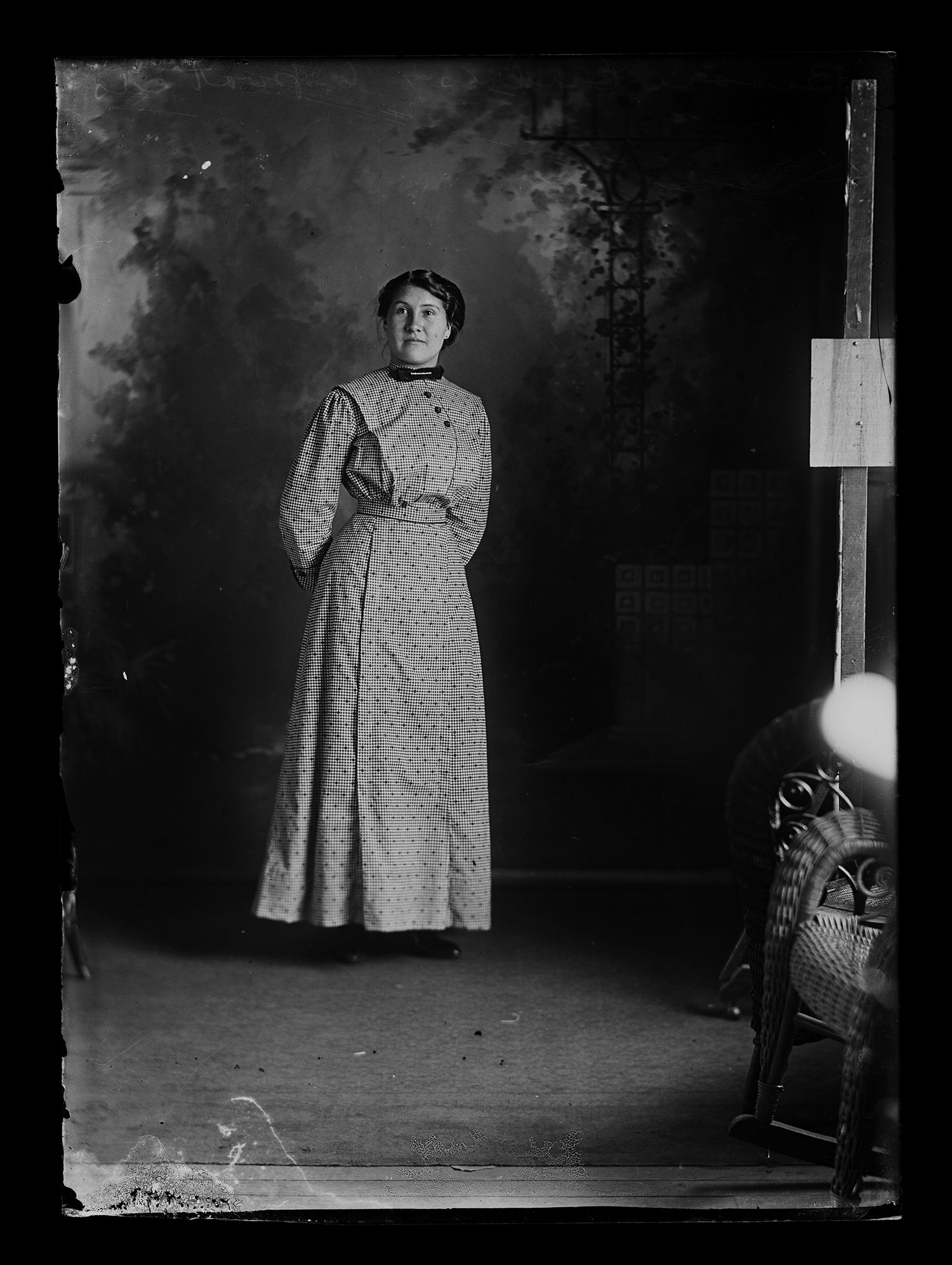 Summary: Mrs. Jake Halsey (formerly Bessie Encres) stands posed for a portrait. She wears a high-necked dress with three dark colored buttons on the front. Her hands are clasped behind her back. A wicker chair is visible in the foreground