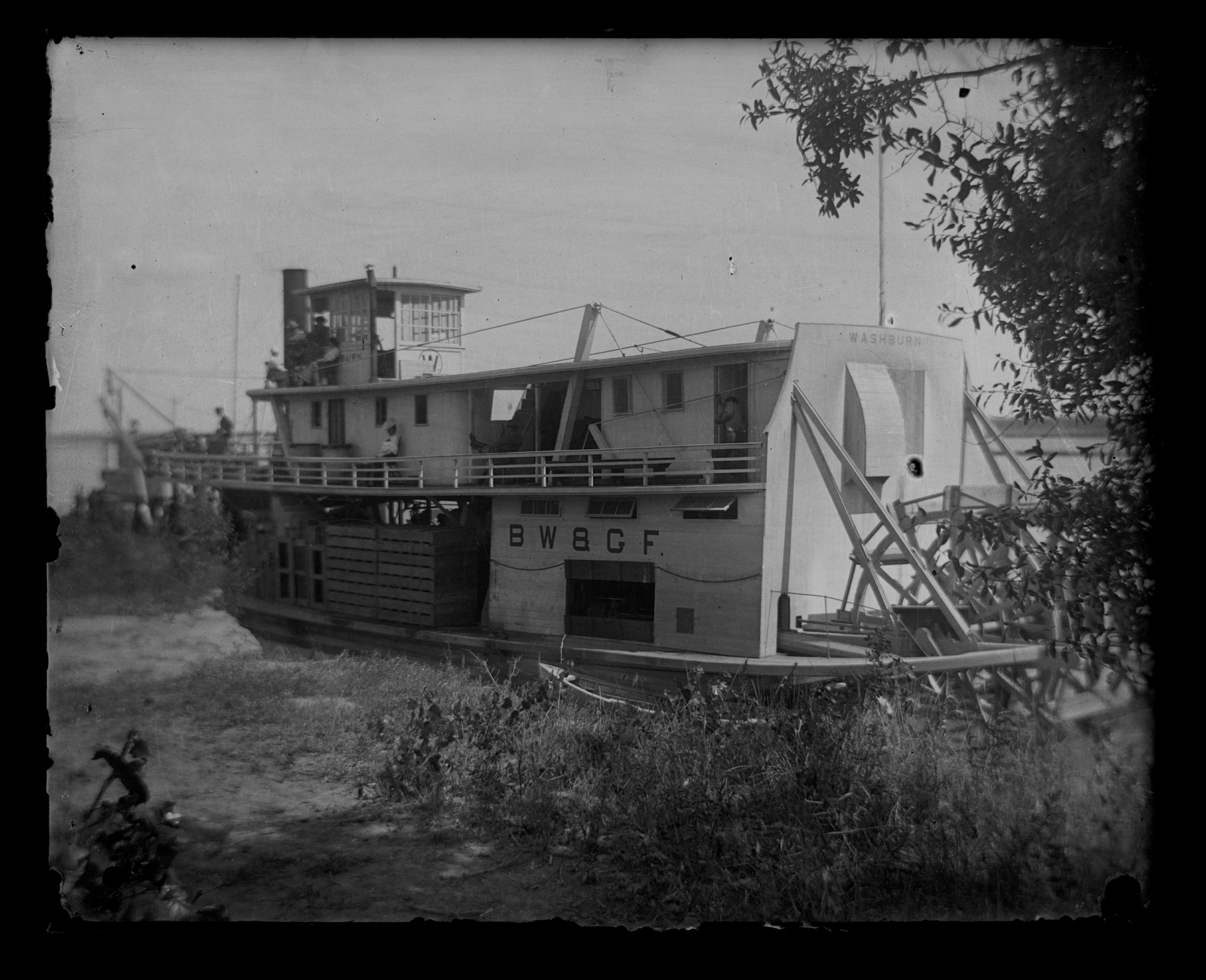 Summary: The steamboat Washburn is docked at the river's edge. The initials, "B W & G F" for Bismarck, Washburn, and Great Falls Railway, are painted on the side of the boat. At least 6 people can be seen on the boat.||The Washburn, a sternwheel packet with a wood hull, was built in Bismarck, N.D., in 1901. She became one of Benton Packet Co.'s fleet organized 1904 by Capt. Isaac P. Baker. She was lost in ice at Crockett's Bluff, Ark., on Jan. 12, 1918.