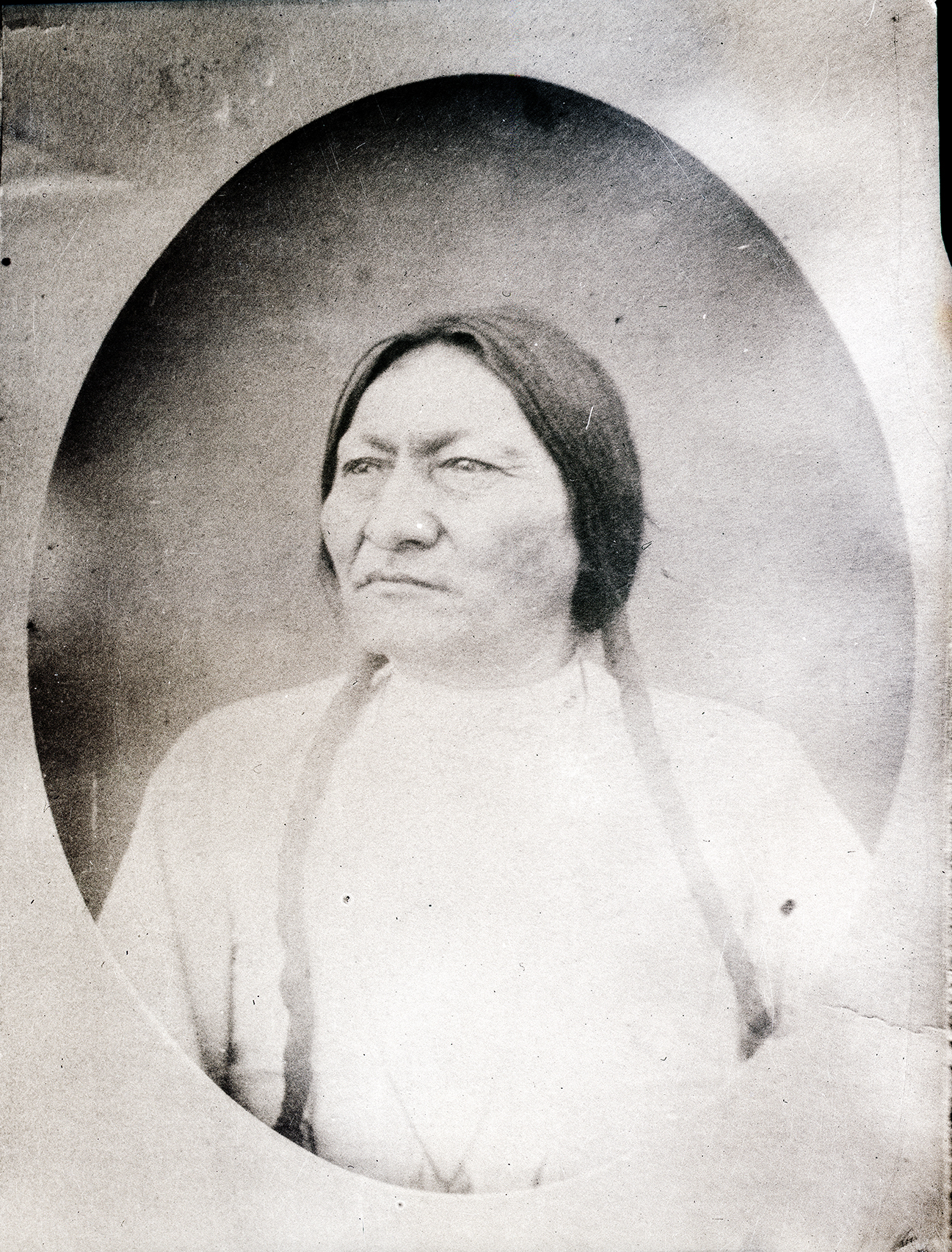 Summary: Copy of head and shoulders, three-quarter face studio portrait of Sitting Bull, a Native American (Hunkpapa Sioux) man. He wears two braids wrapped in cloth. Printed as an oval on paper. Photographer: W. R. Cross.