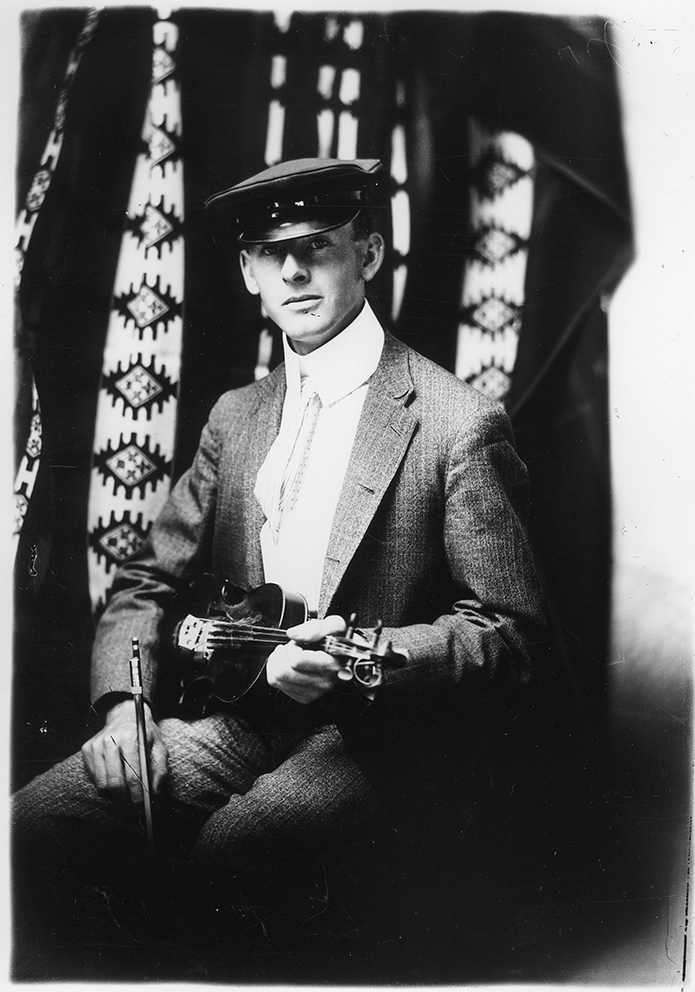 Summary: Frank Fiske wears a striped suit and flat cap and holds a violin and a bow in this portrait. He sits in a chair in front of a blanket draped as a backdrop