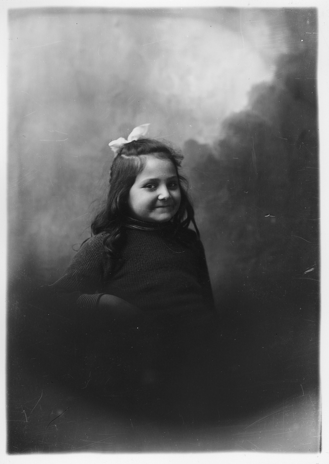 Summary: Olive Primeau sits posed for a portrait. She wears a dark dress and a bow in her hair