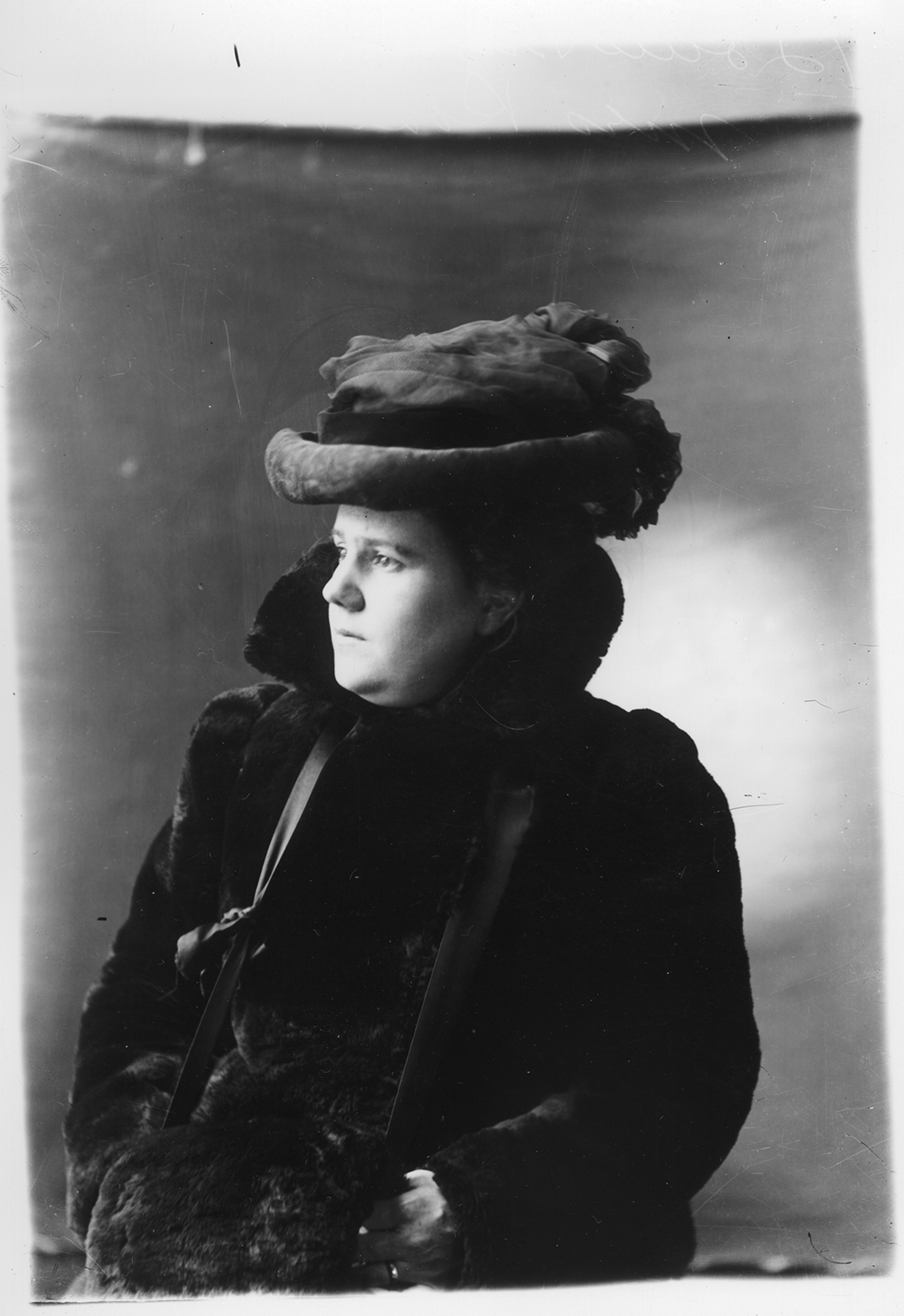 Summary: Mrs. Rose Primeau sits posed for a portrait. She wears a fur coat, hat, and rests her hands in a fur muff