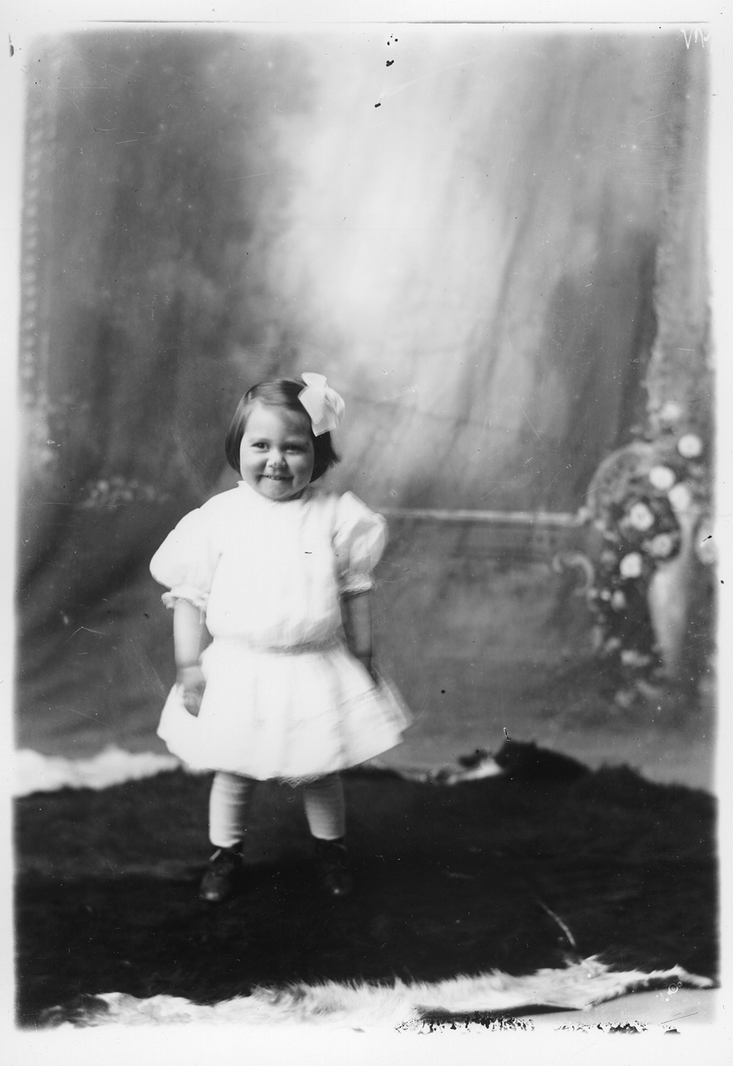 Summary: Rose Flavia Primeau stands posed for a portrait. She wears a white dress and has a bow in her hair. She is standing on a large animal skin