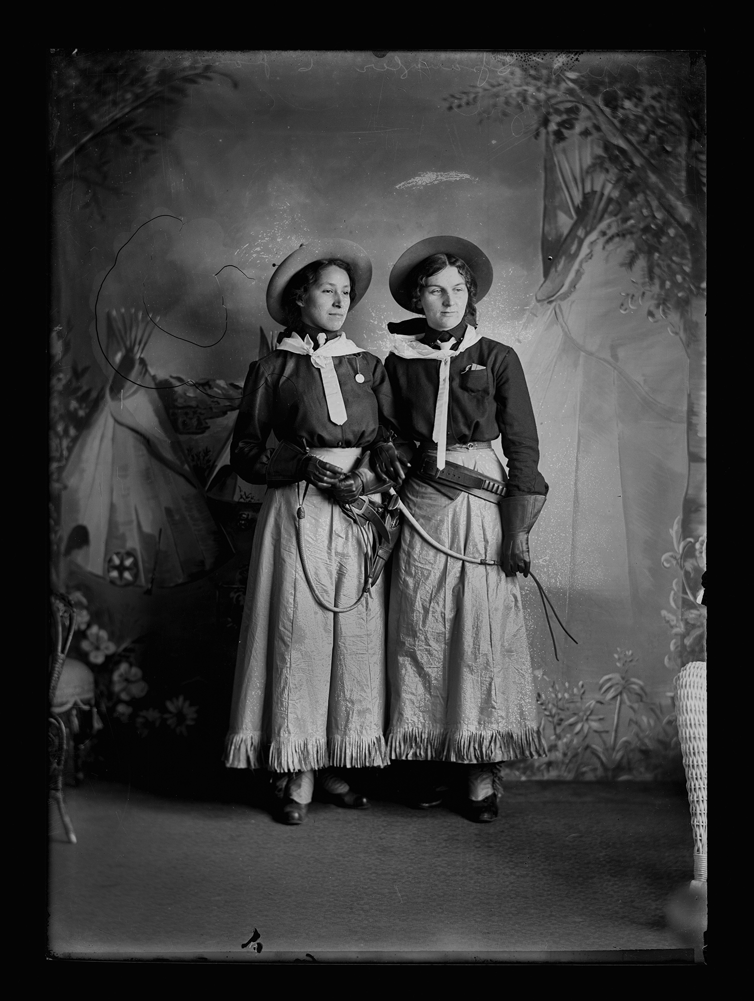 Summary: Grace Primeau and Laura Fiske dress as cowgirls for this portrait. Both wear hats, neckerchiefs, and neckties, long gloves, gunbelts, and fringed skirts. They stand in front of a backdrop with tipis painted on it