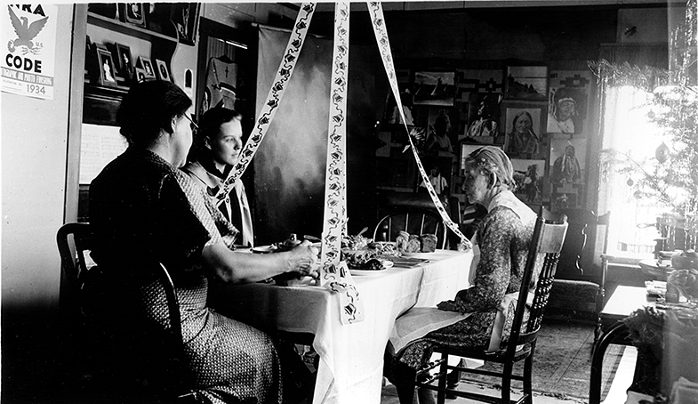 Summary: Three female members of the Fiske family meet for breakfast on Christmas 1934. Crepe paper decorated with bells hangs from the ceiling, and the table is set with a variety of foods. Family portraits and examples of Fiske's Indian photography decorate the walls. An NRA Code poster for Photographic and Photofinishing on the wall identifies the year as 1934.