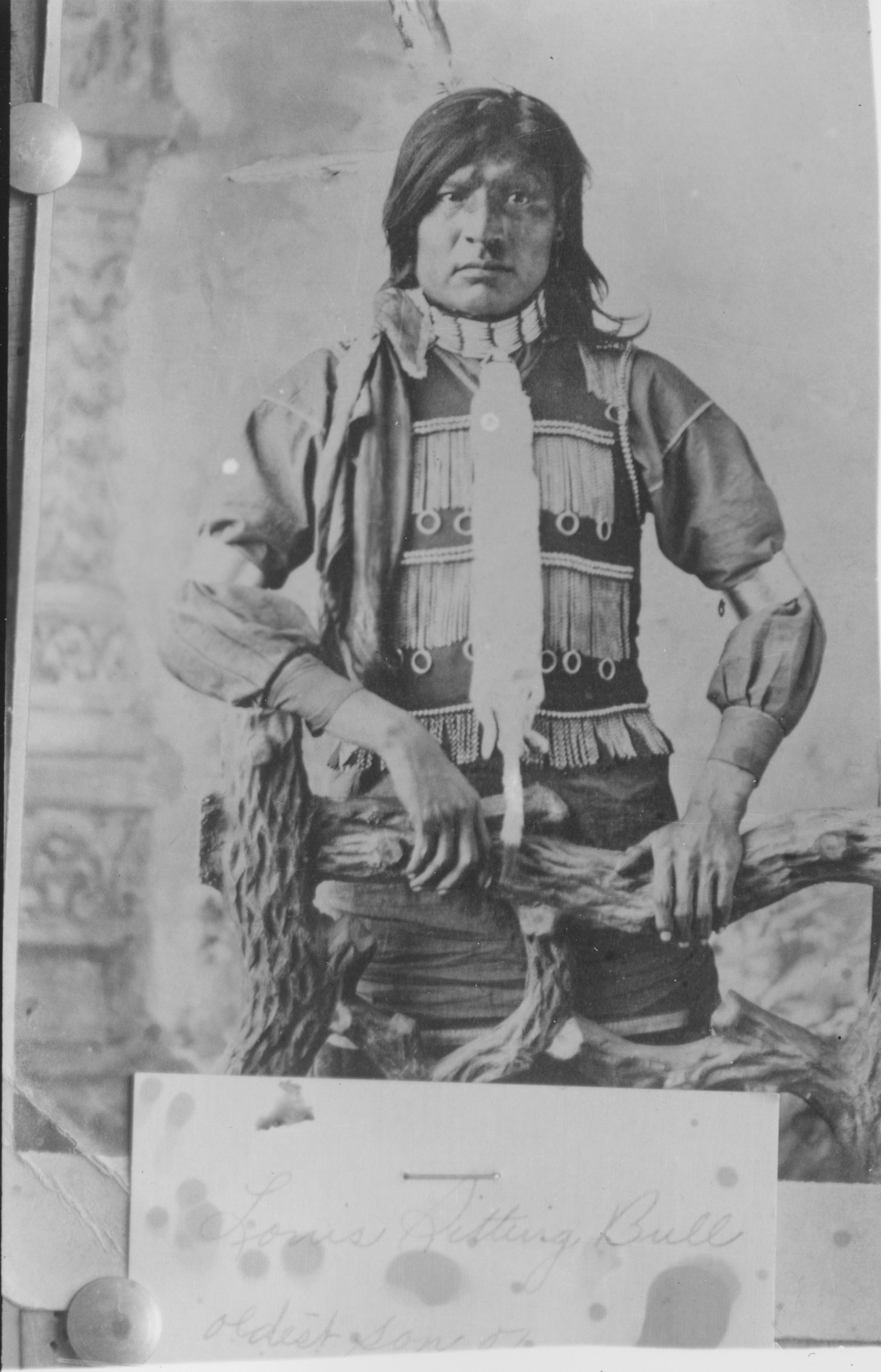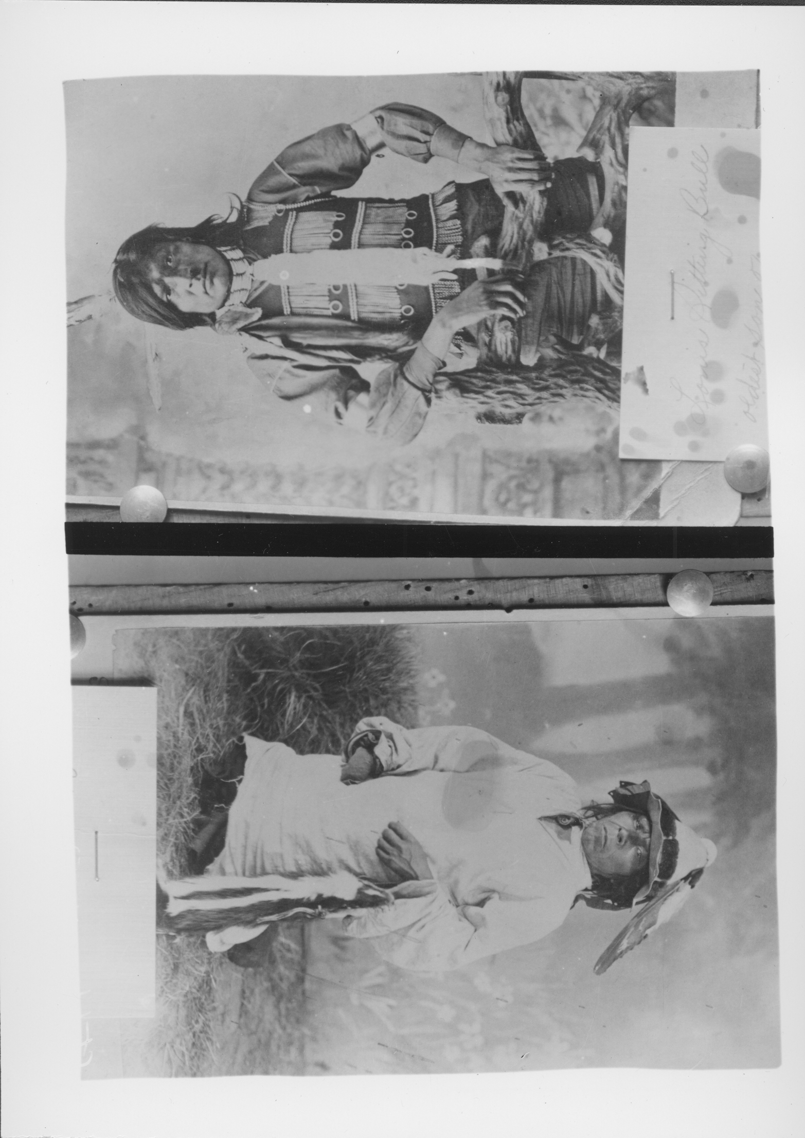 Summary: Copies of two studio portraits. Louie Sitting Bull 3/4 length standing studio portrait with painted backdrop, wearing two feathers in hair, necklace around throat with fur piece attached, scarf tied in hair, vest with metal beads and chains, metal armbands, hands on log fence.See 2019-P-035-00001. Steps wearing white overcoat and hat with bird wing.