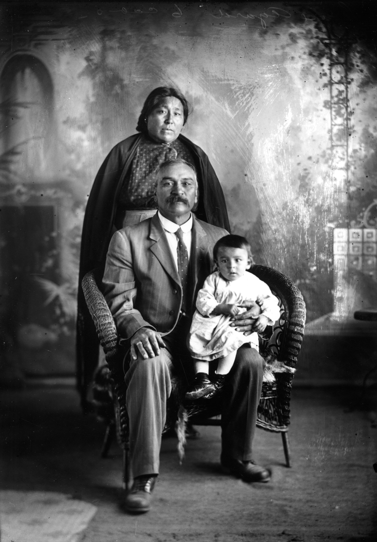 Summary: Louis Agard and his family are posed for a formal portrait. He sits in a wicker chair, holding a small child. A woman stands behind him, wearing a long shawl and a patterned shirt.