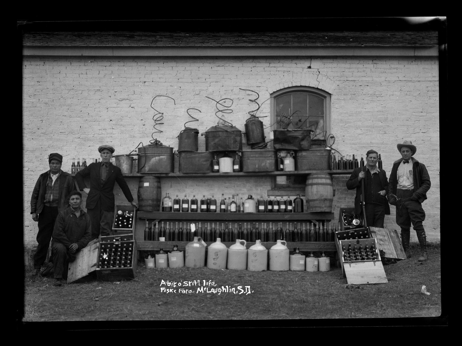 Inscription/Marks: [Handwritten on back of print] 1952-1623 Stills confiscated l-r 1. John Brought Plenty 2. Mr. Brought, Mossman's son-in-law Sitting Jersey Gray Bear 3. Mossman 4. Two-Gun Hart.[history-Officers make booze raids Sioux County Pioneer Thursday 01-07-1926 p01] Officers Make Booze Raid Get many victims besides lot of evidence and other paraphernalia. Superintendent E. D. Mossman, who insists upon keeping intoxicating liquors of all kinds off from the Standing Rock reservation has been making it very miserable for those engaged in the traffic during the past week and his activities will be continued until the reservation is as dry as the Sahara desert. He has as an able assistant, R. J. (Two-Gun) Hart, who is recognized as a most crafty enforcement officer. Their first arrest was an accident. Two young fellows, brothers, hailed them on the road between here and McLaughlin through in South Dakota, they being without gas. The enforcement officers gave them the gas and discovered them more or less intoxicated. Upon further investigation they found the men had booze upon them and they were induced to offer the officers a drink. And later they were able to get them to sell them two quarts of whiskey, real Canadian stuff, two for $15 or $8 per. They had about eight quarts with them but started from the Canadian border with 92 bottles and had made numerous trips. They were taken to Timber Lake and before a United States commissioner one was bound over to the United States court. The defendant is John A. Scherbinske and hails from Kulm. His car, a Chevrolet coupe was also confiscated. His partner, a brother, was found not implicated and was turned loose. The officers also picked up a Ford car in South Dakota. Four Indians being in it and there was found one half gallon of booze. The occupants were taken to Timber Lake for arraignment and the car confiscated. New Year’s eve, Mose Wilkie, Henry Stewart and Sidney Claymore happened to be at Solen at a dance and there picked up one, Alfred Jensen, with a bottle of moon. He was brought before Justice Thomas Short in Fort Yates and put up a bond of $300 to appear at the next term of district court. He lives across the line in Morton County. On December 20, Johannus Schulz, who lives northeast of McLaughlin, in South Dakota was arrested by the local officers and put under $1000 bond to appear in Corson County court. Here they grabbed a still, coil, 27 bottles of beer and paraphernalia in connection with operations. A raid was made in the vicinity of Selfridge Monday and seemed very successful. John Klingler was arrested and his place searched. There they got a still, six gallons of whiskey, 100 bottles of beer and mash. He appeared before G. W. Hokanson, U. S. Commissioner and was bound over to the U. S. Court His bonds of $1500 were furnished by Segur Robinson and W. H. Ordway signing. On the place of Barney Bonagofsky the officers got a still and mash. At Charles Arndt's two copper stills, coils and a small amount of whiskey and bottles. At the Charles Snyder place 45 bottles of beer was found and lots of empties. The last three named defendants were not at home but word left for them to appear here. They appeared later and put up bonds. Tuesday, Mr. Hart and Jesse Graybear took a circle up around Cannon Ball and with Farmer R. H. Shipman picked up Frank Slawa across the Missouri River from that point and confiscated a five gallon jug of moonshine. He was ordered to appear at Fort Yates and furnish a bond for his appearance in U. S. Court. The officers still are actively engaged in hunting out violations and there will probably be more arrests. All the officers engaged were deputy special officers and besides those mentioned above who have taken part in various raids were J. H. Brott, Eugene Bearking, Sam Red Pheasant, Jesse Graybear and Francis Mossman.