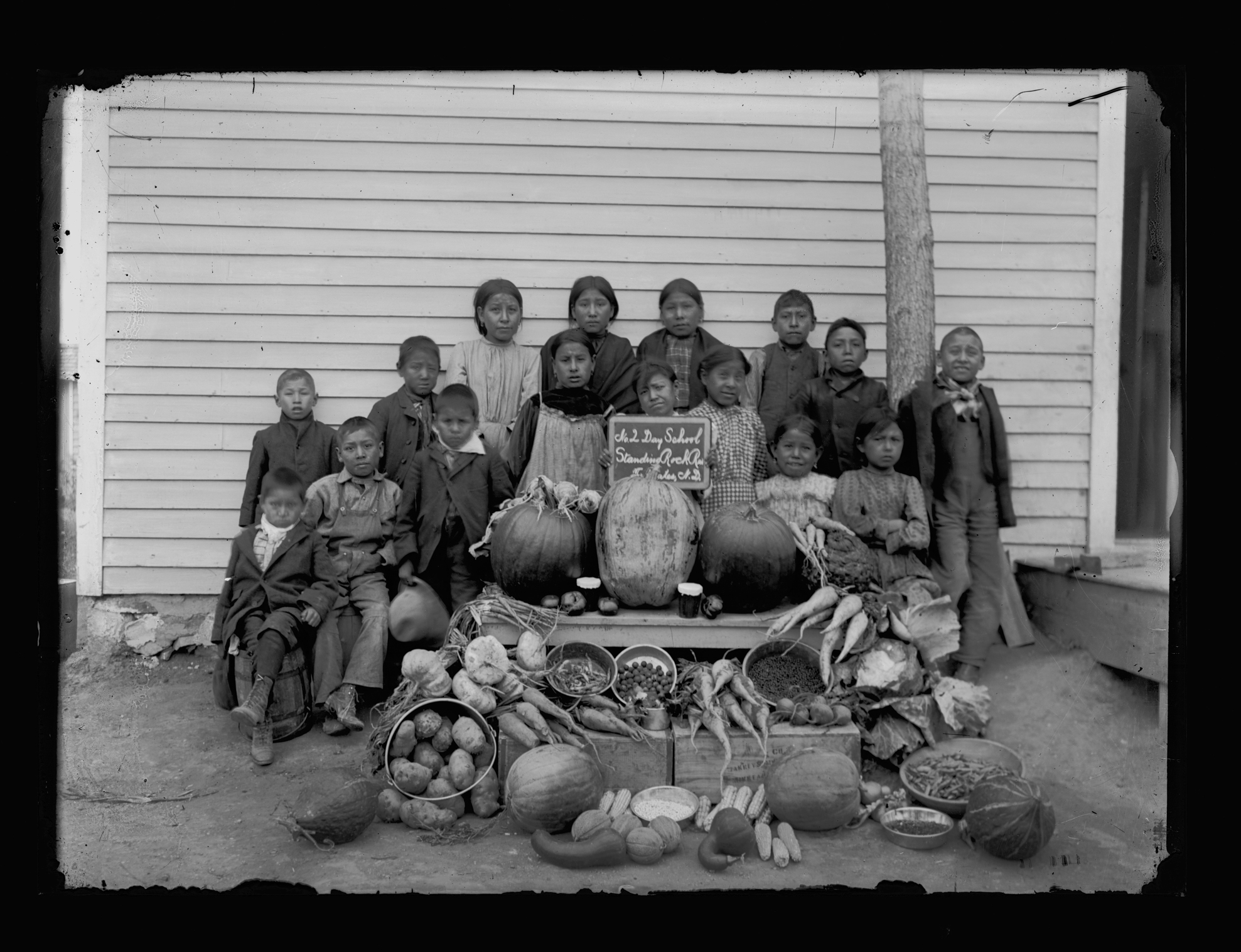 Summary: Students from Number 2 Day School at the Standing Rock Agency pose with vegetables they have likely grown in the school garden.
