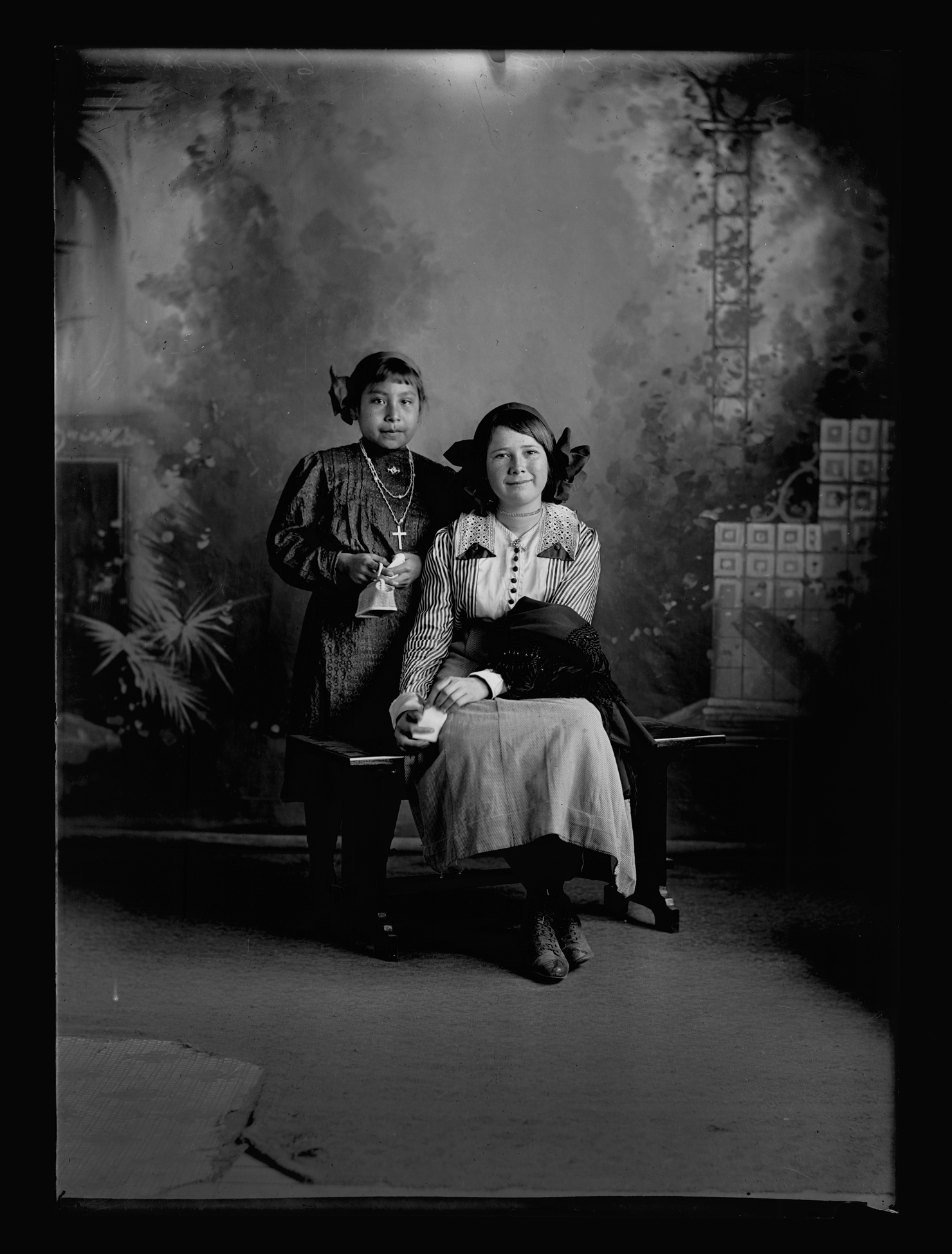 Summary: Young girl in dark toned knee-length dress, holding small purse with crucifix on chain around her neck stands behind a seated older girl in a striped blouse with light-toned skirt.