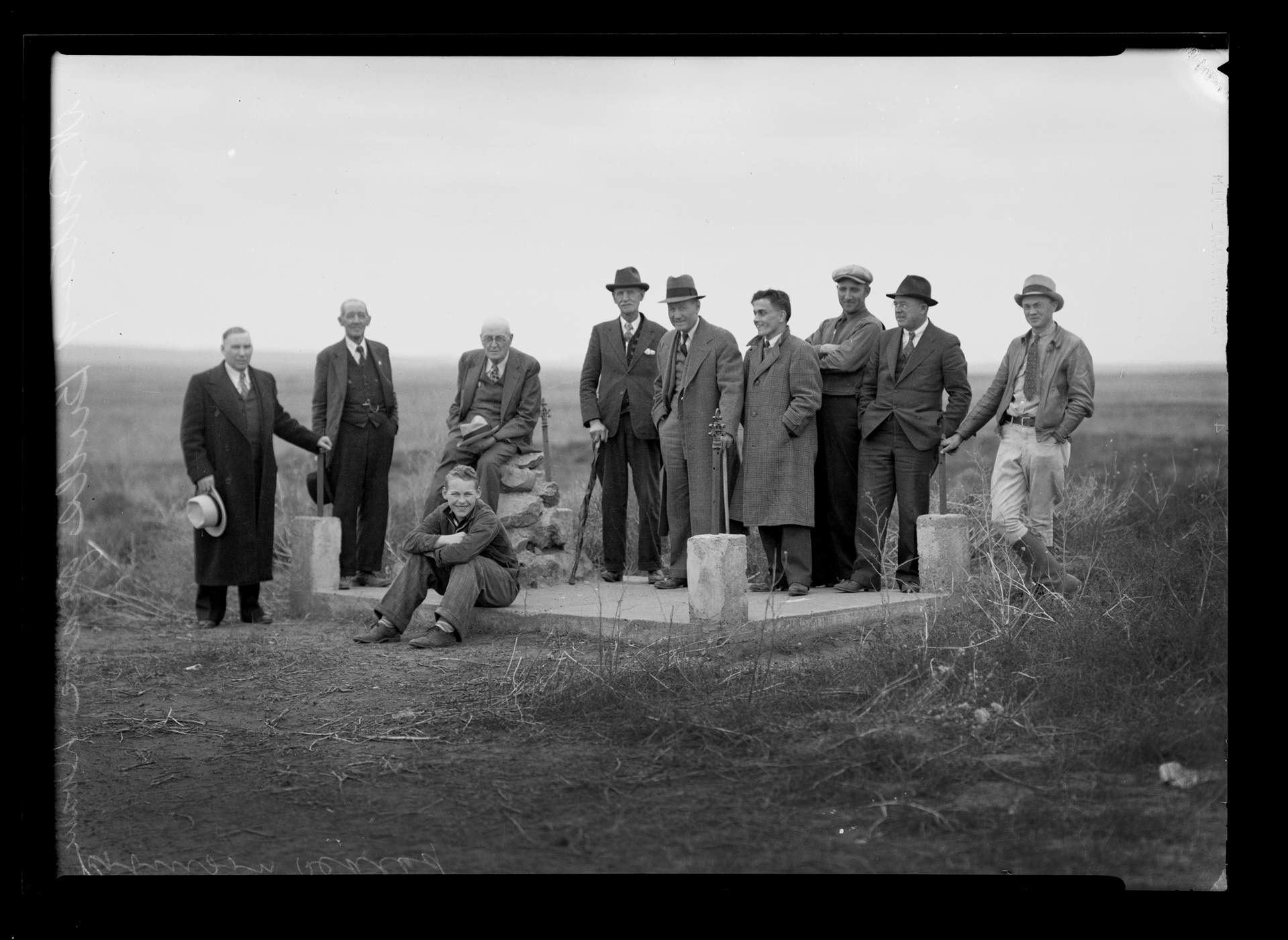 Inscription/Marks: [in pencil on negative emulsion] Doan Robinson Sitting Bull’s grave Fort Yates. [bio]Jonah LeRoy "Doane" Robinson (October 19, 1856 – November 27, 1946) was a state historian of South Dakota who conceived of the idea for the Mount Rushmore National Memorial. Early life Robinson was born in Sparta, Wisconsin. His sister could not pronounce his name (Jonah LeRoy), so she called him Doane. Robinson became a farmer in Minnesota, but soon abandoned the job to become a lawyer. Later, he took interest in history, and received the position as South Dakota's state historian. In that position, he conceived the idea of the Mt. Rushmore monument. Mount Rushmore After reading about Stone Mountain, Robinson was suddenly inspired to sculpt the Needles, several pillars made of granite, into likenesses of famous people. He hoped that such a sculpture would attract greater tourism to South Dakota. After failing to contact Lorado Taft, who was ill, Robinson gained the support of Gutzon Borglum. He was also backed by Senator Peter Norbeck. Robinson began efforts to raise funds for the project and to receive permission to carve the Needles. The funds were denied, and many groups including Native Americans disliked the idea. Environmentalist Cora Johnson of the Hot Springs Star felt that such a carving would destroy the landscape. On Borglum’s second meeting with Robinson, Borglum switched the location of the carving from the Needles to Mount Rushmore. Borglum also decided that the sculptures should have a larger national focus, and he selected the four presidents. The headquarters of the project, south of Mount Rushmore, became known as Doane Mountain. In 1929, President Calvin Coolidge finally signed a bill which created to a commission to oversee the sculpting. Robinson failed to become part of the commission, which greatly disappointed him. Following his retirement from being a historian, he returned to farming, and lived to see the completion of Mount Rushmore. He died on November 27, 1946 in Pierre, South Dakota. Publications • History of South Dakota • A History of the Dakota or Sioux Indians from their earliest traditions and first contact with white men to the final settlement of the last of them upon reservations and consequent abandonment of the old tribal life • A Brief History of South Dakota • Doane Robinson's Encyclopedia of South Dakota