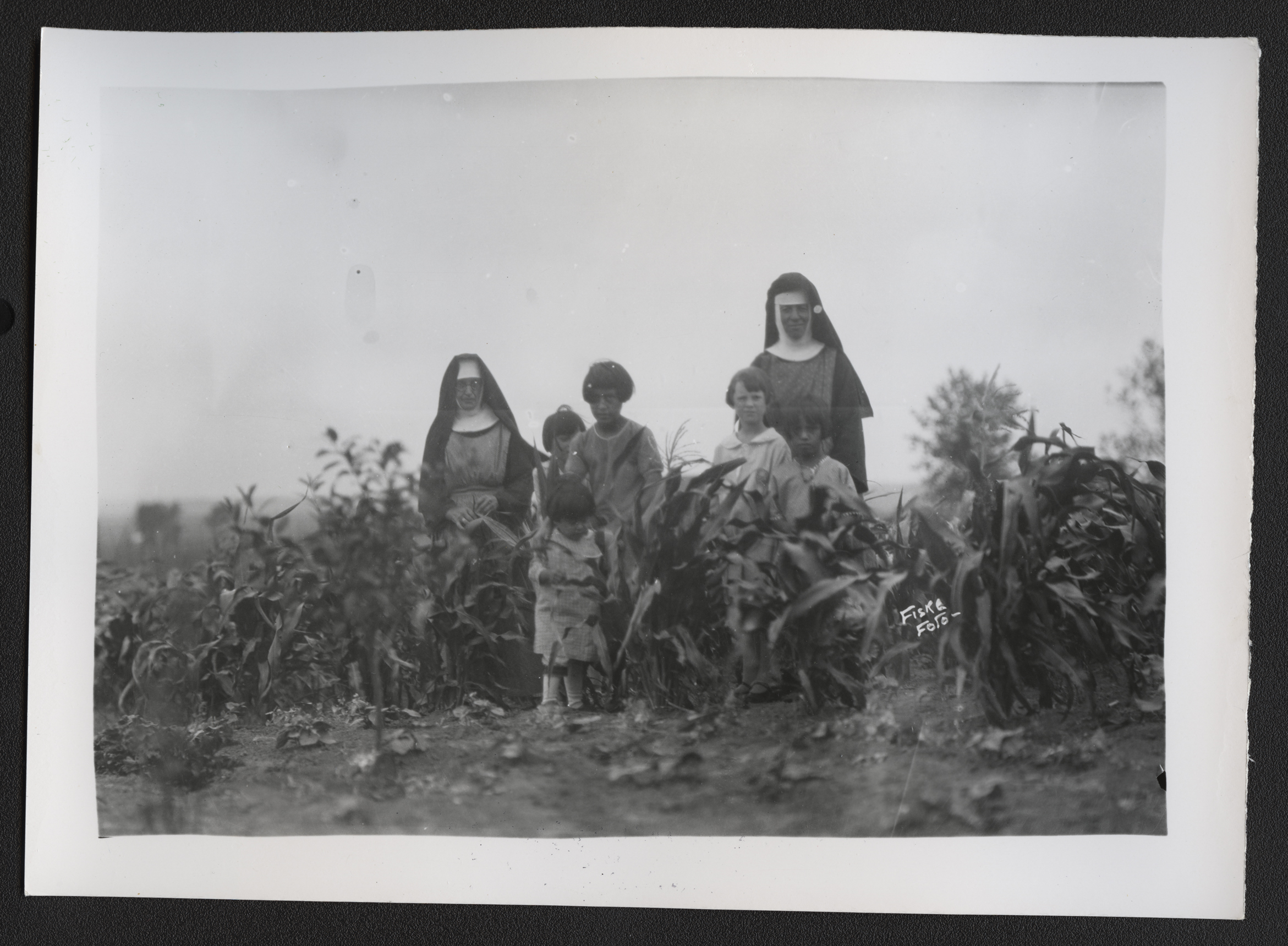 Title: Sister Cherubin and another Catholic sister in garden with children, Fort Yates (N.D.)