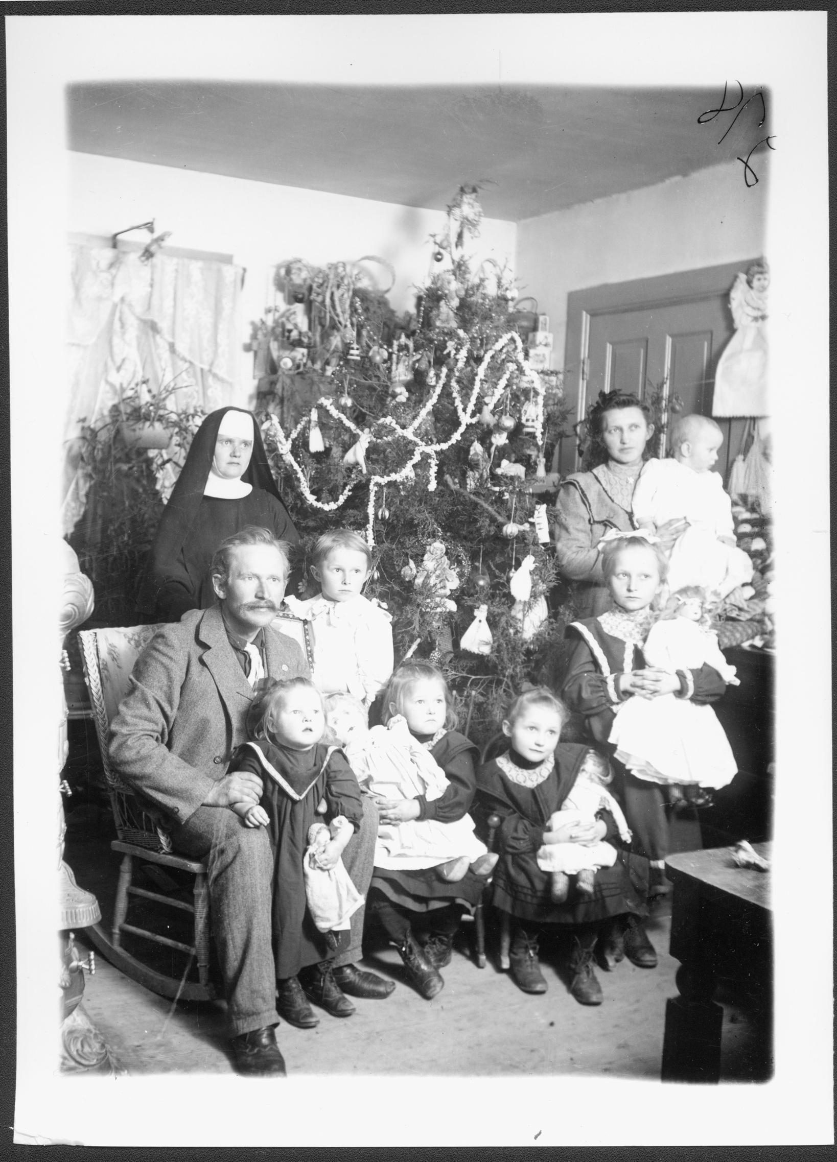 Summary: Sister Wallburger with her family. The young girls are holding dolls. The Christmas tree is behind the group.