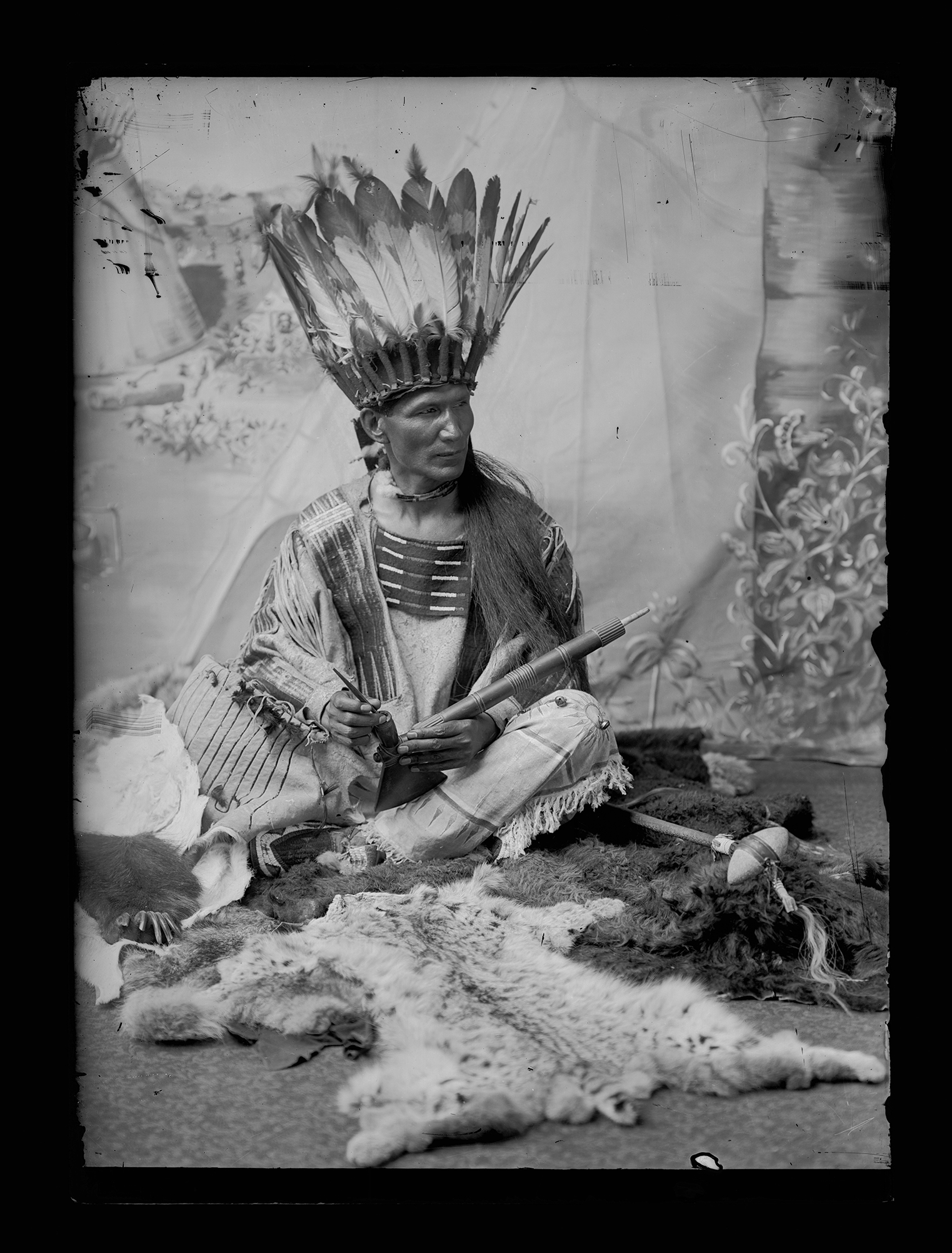 Summary: Full length seated studio portrait of Dr. Charles Eastman in regalia with war bonnet, fringed and quilled tunic over leggins and quilled moccasins. He is seated cross-legged holding a pipe which he is preparing. In front of him are various skin rugs and a war club. Behind him is a painted backdrop with a tree, floral designs and tipis.
