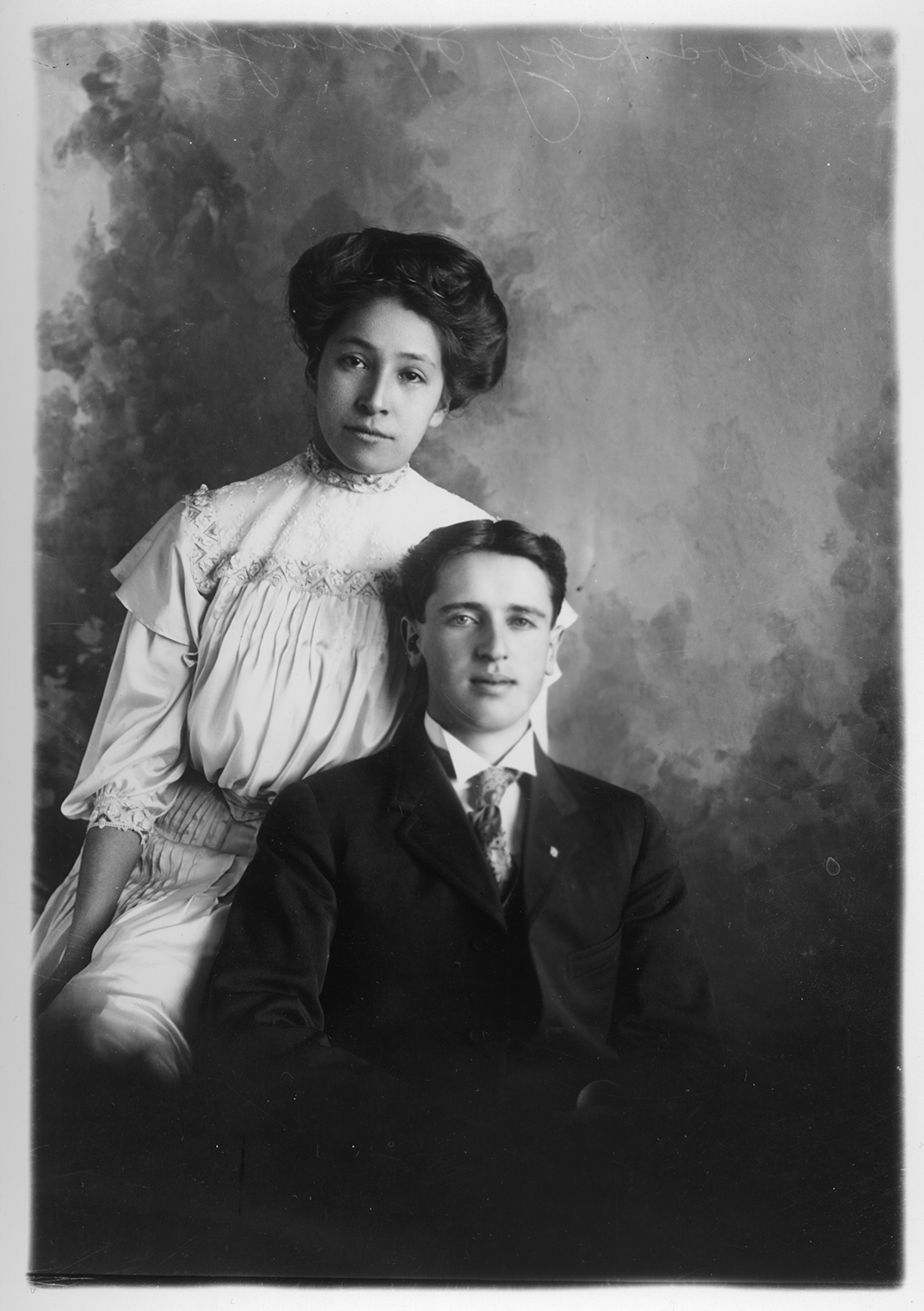 Summary: Studio portrait. She wears a white dress with high collar, and he is dressed in a suit. A small pin is visible on the lapel of his coat