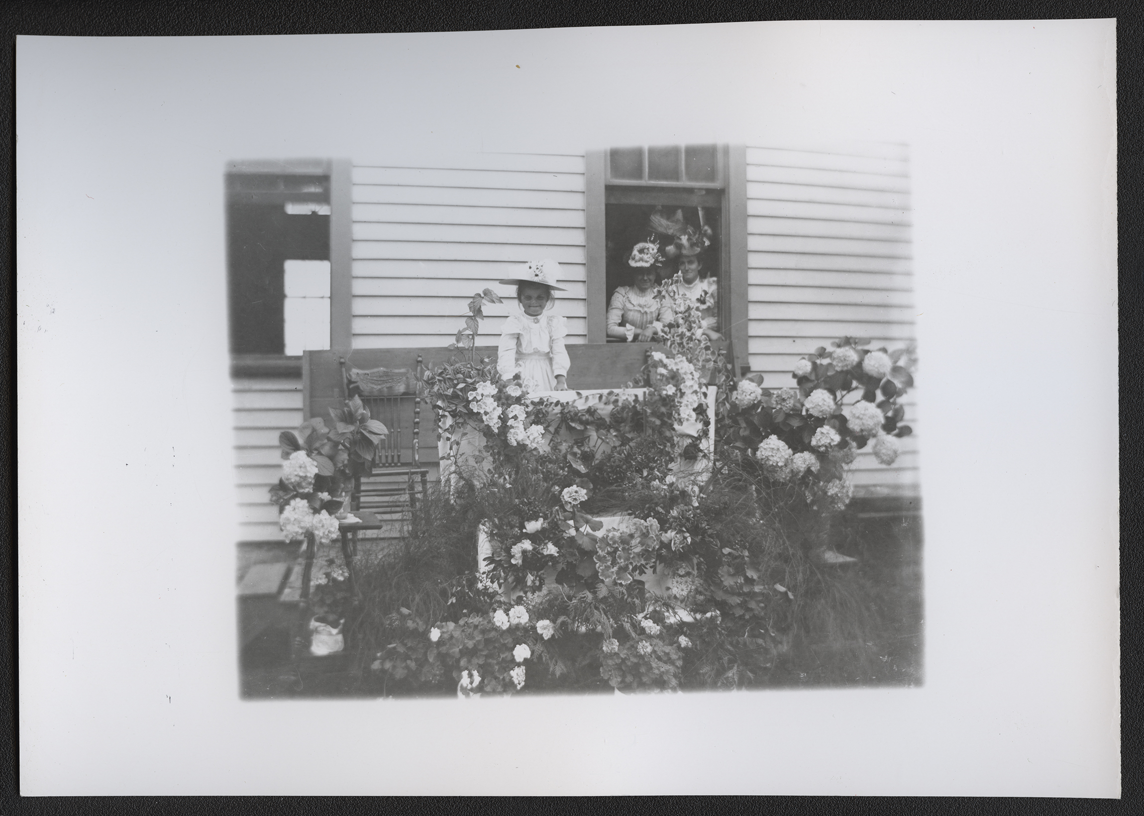 Title: Women and girl with flowers in front of house, Fort Yates (N.D.)