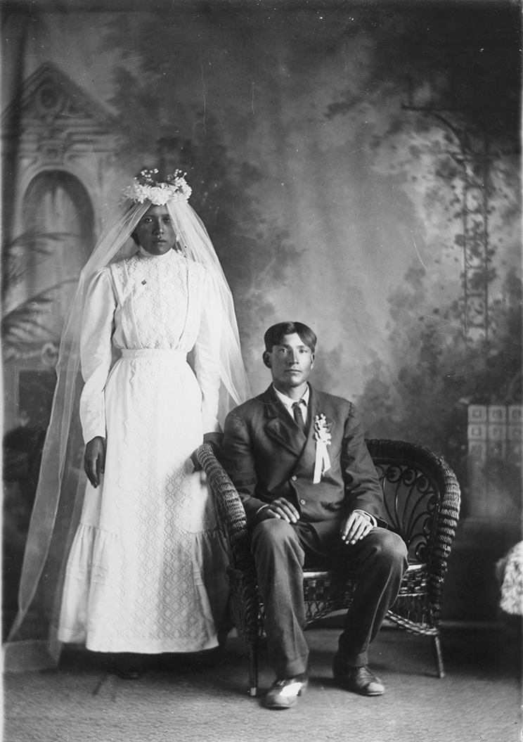 Summary: Mr. and Mrs. Dick Ramsey pose for a portrait in their wedding attire. Mr. Ramsey is seated and wears a dark suit and ribbon on his lapel, while Mrs. Ramsey stands behind him in a white dress and veil