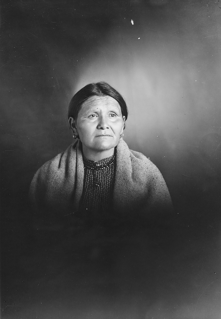 Summary: Mrs. Philip Bull Head sits posed for a photograph. She wears a patterned dress, a shawl, and has earrings in both ears