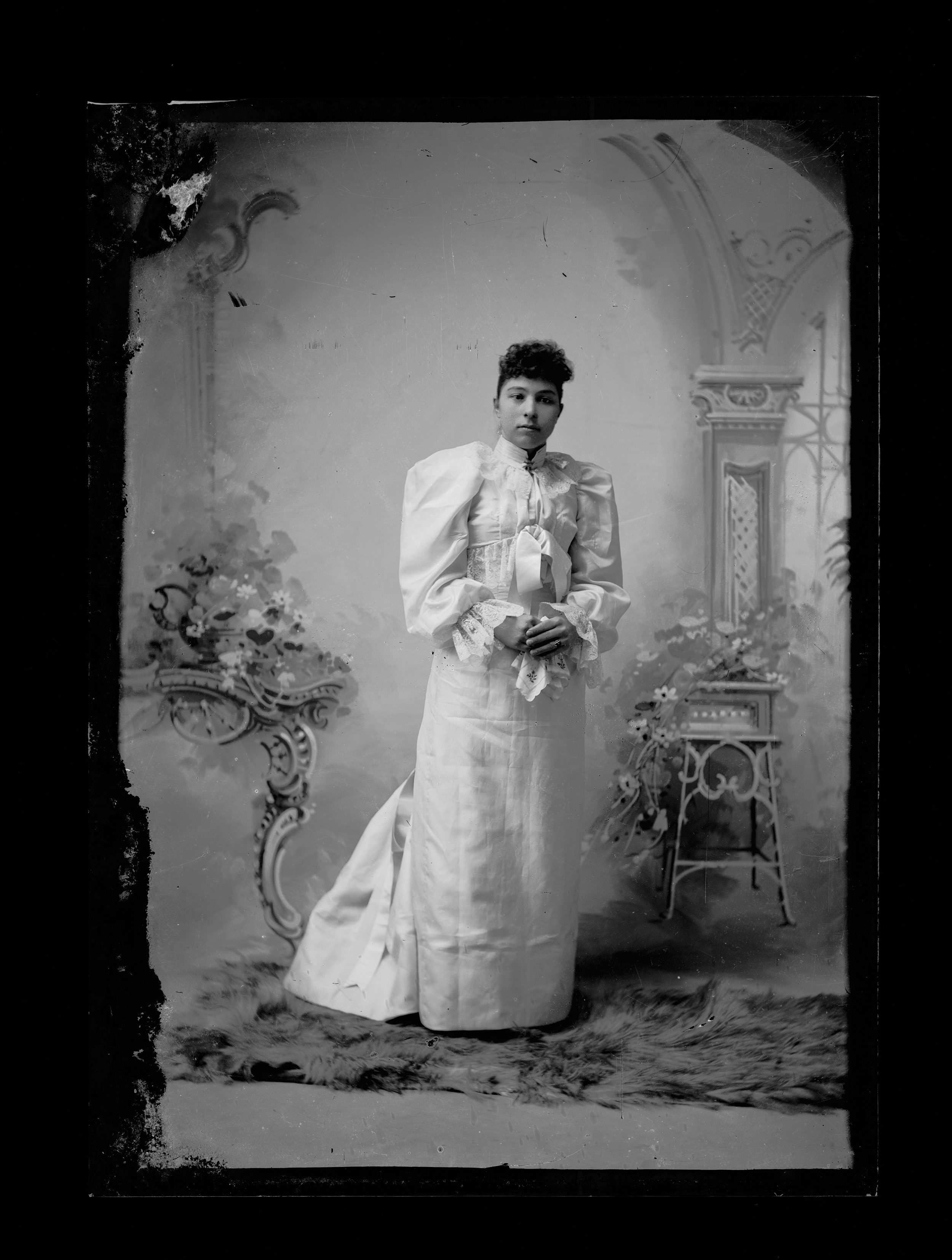 Summary: Sophie White Eagle stands in a light-colored gown with puffed sleeves and a train. She stands in front of a backdrop covered with flowers and arches.