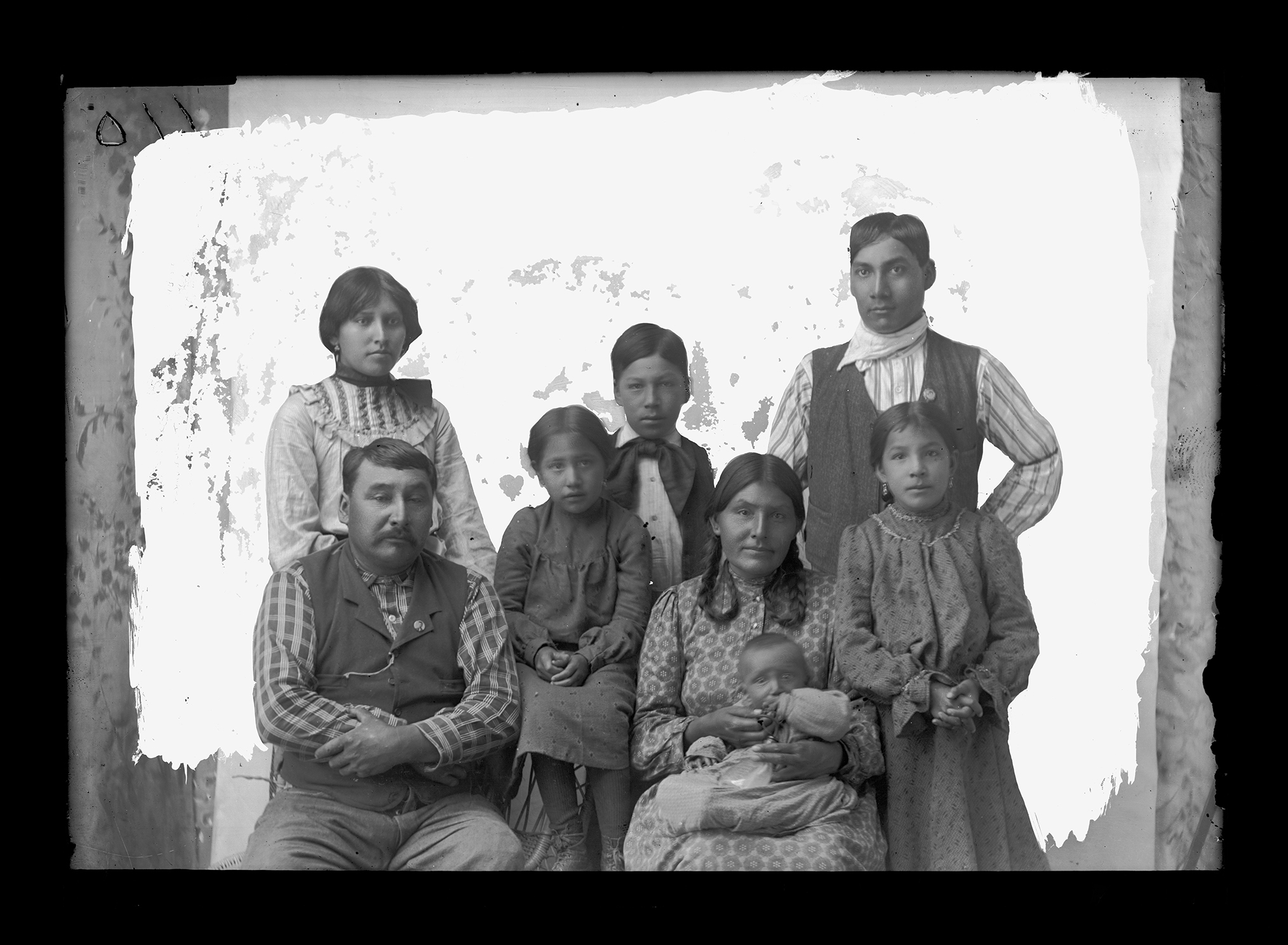 Summary: William Cadotte and his family are posed for a portrait. Mr. Cadotte, his wife, an infant, and a young daughter are seated, while two older daughters and sons stand