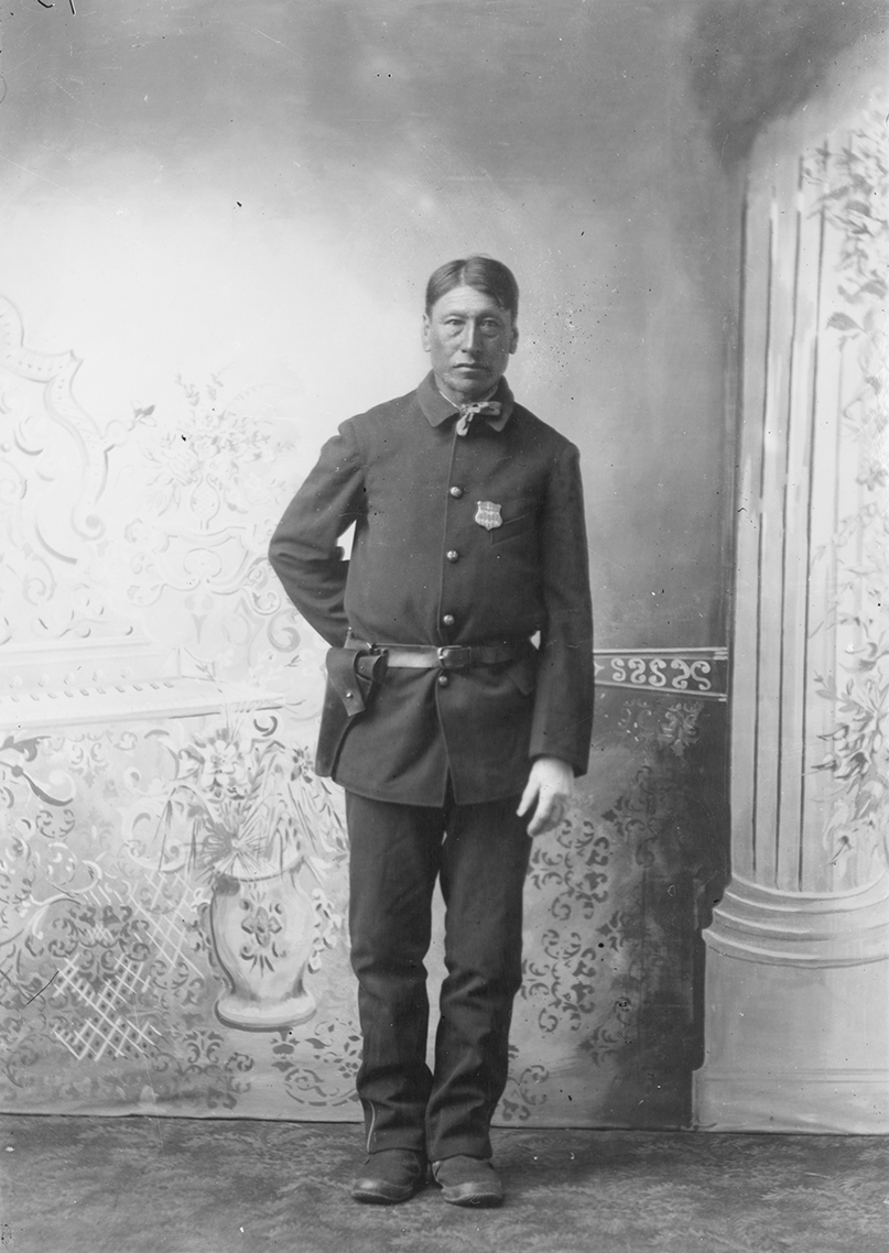 Summary: Stone Man stands posed for a portrait. He wears the uniform of an Indian policeman, including a badge and gunbelt.