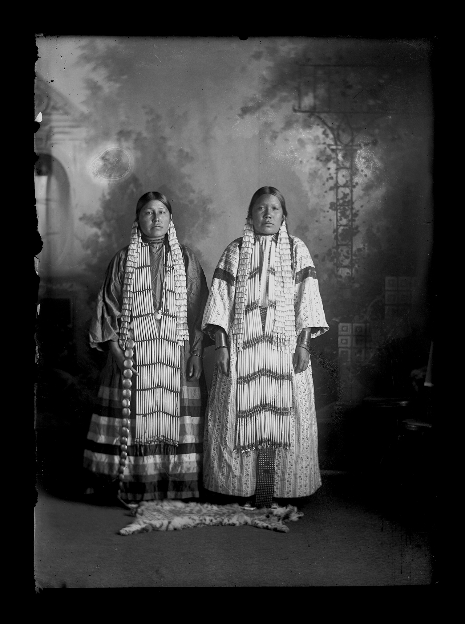 Summary: Matilda One Horn and Mrs. Eugene Yellow Lodge stand posed for a portrait. Both women wear long dresses, necklaces, bracelets, and hair ornaments. An animal skin is on the floor in the foreground.