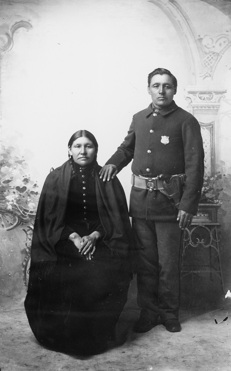 Summary: Mr. and Mrs. Francis Fearless pose for a portrait. He stands, and wears the uniform of an Indian policeman, including a badge and gunbelt. Mrs. Fearless sits, wearing a long dark dress with a dark shawl.
