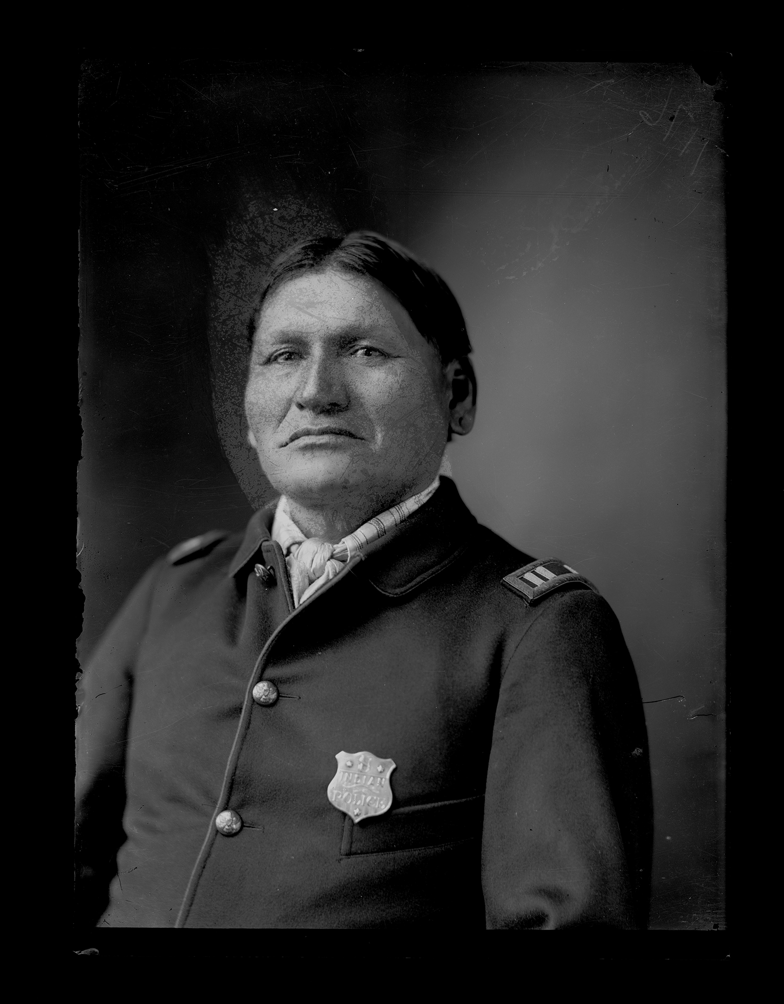 Summary: Standing Soldier, an Indian policeman, sits posed for a portrait. He is wearing his uniform, complete with epaulettes and badge